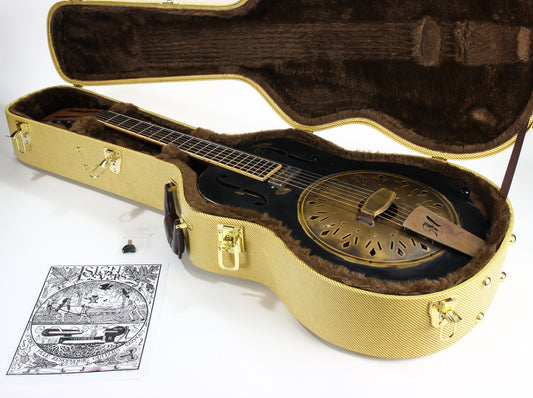2022 Mule Resophonics Resonator Electric Guitar -- Brass Body, Flamed Neck, Aged Black Finish, Pickup, Knob