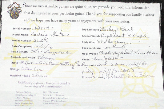 MINT 2011 Alembic Darling Buckeye Burl Top w/ Blue LED's Paperwork, Original Case!