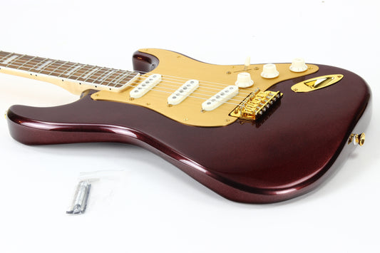 Squier 40th Anniversary Gold Edition Stratocaster Electric Guitar, Ruby Red Metallic, Block Inlays, Big Headstock!