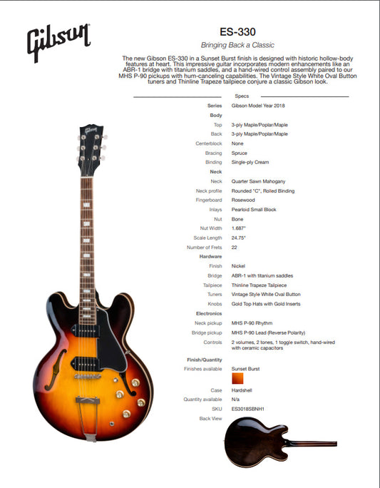 2018 Gibson Memphis ES-330 Sunset Burst w/ OHSC COA! Hollowbody P90's Block Inlays 335