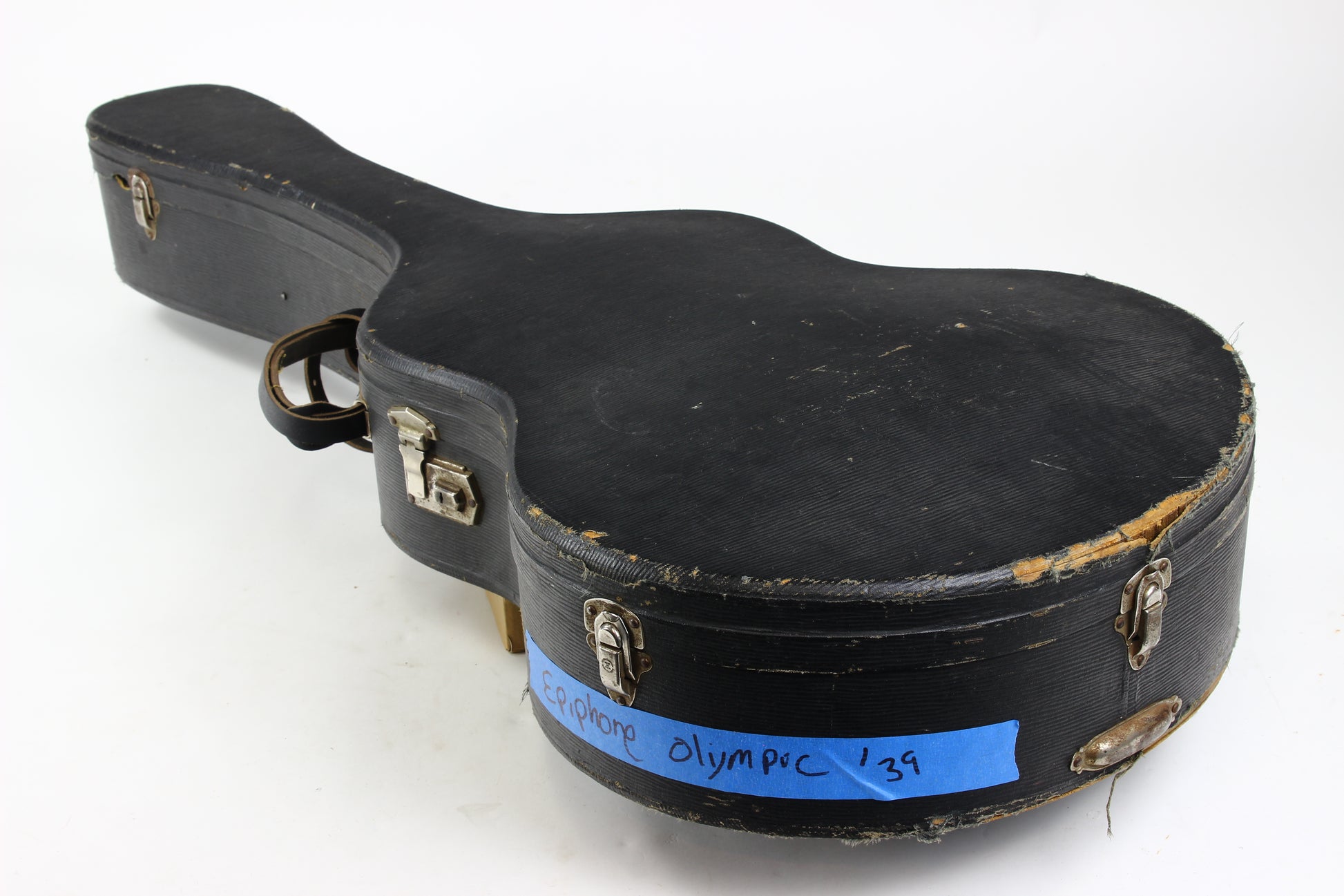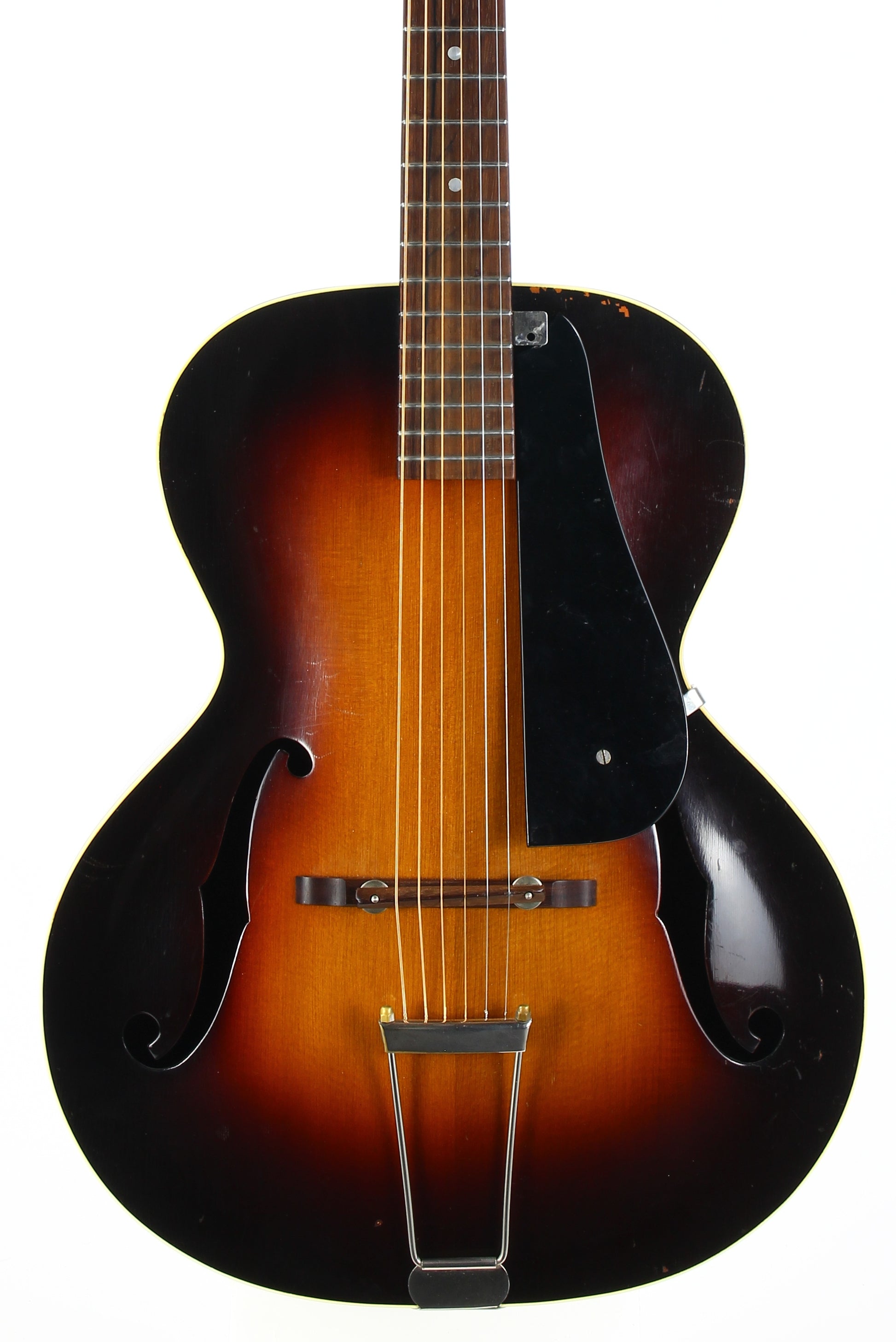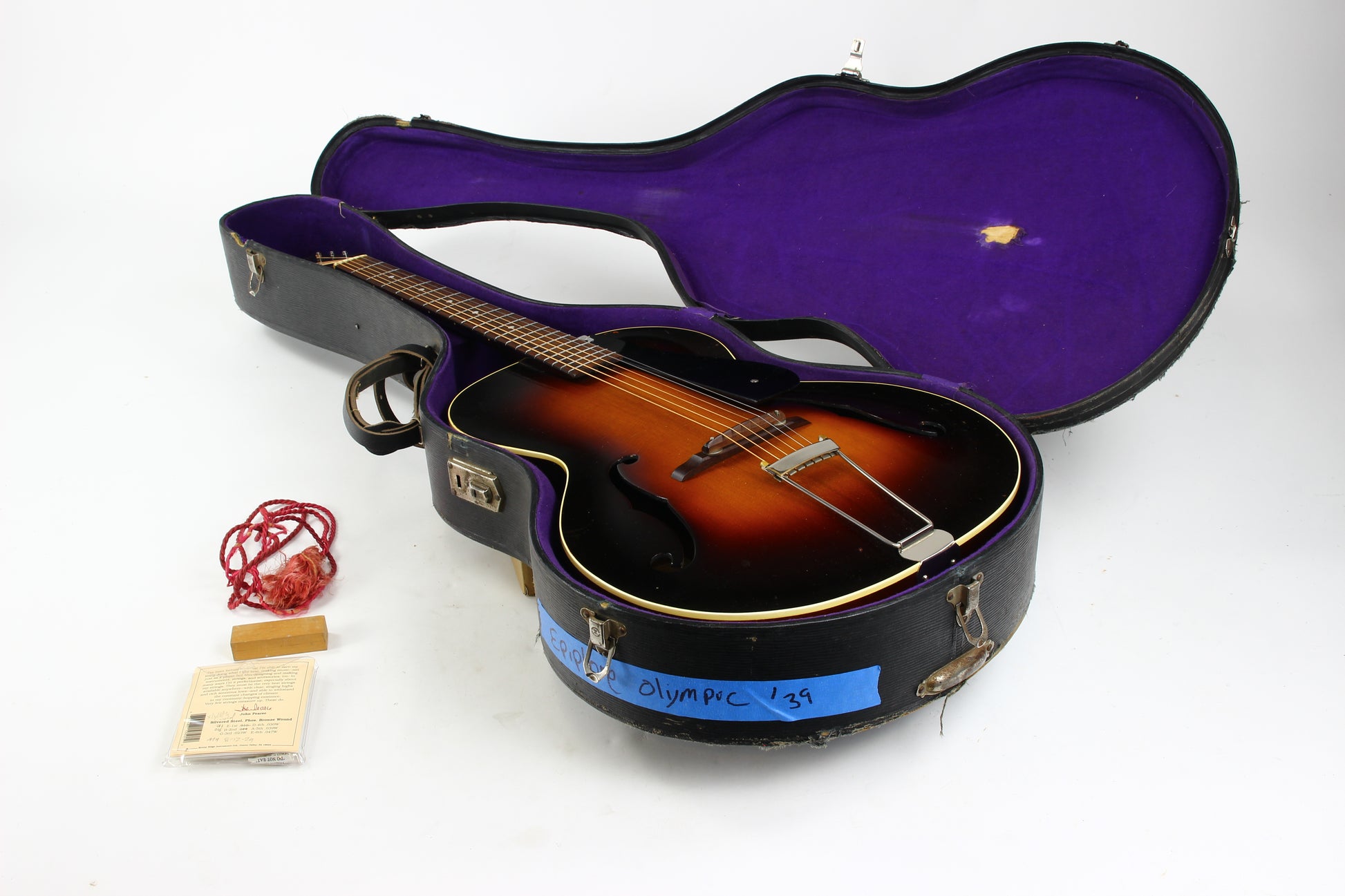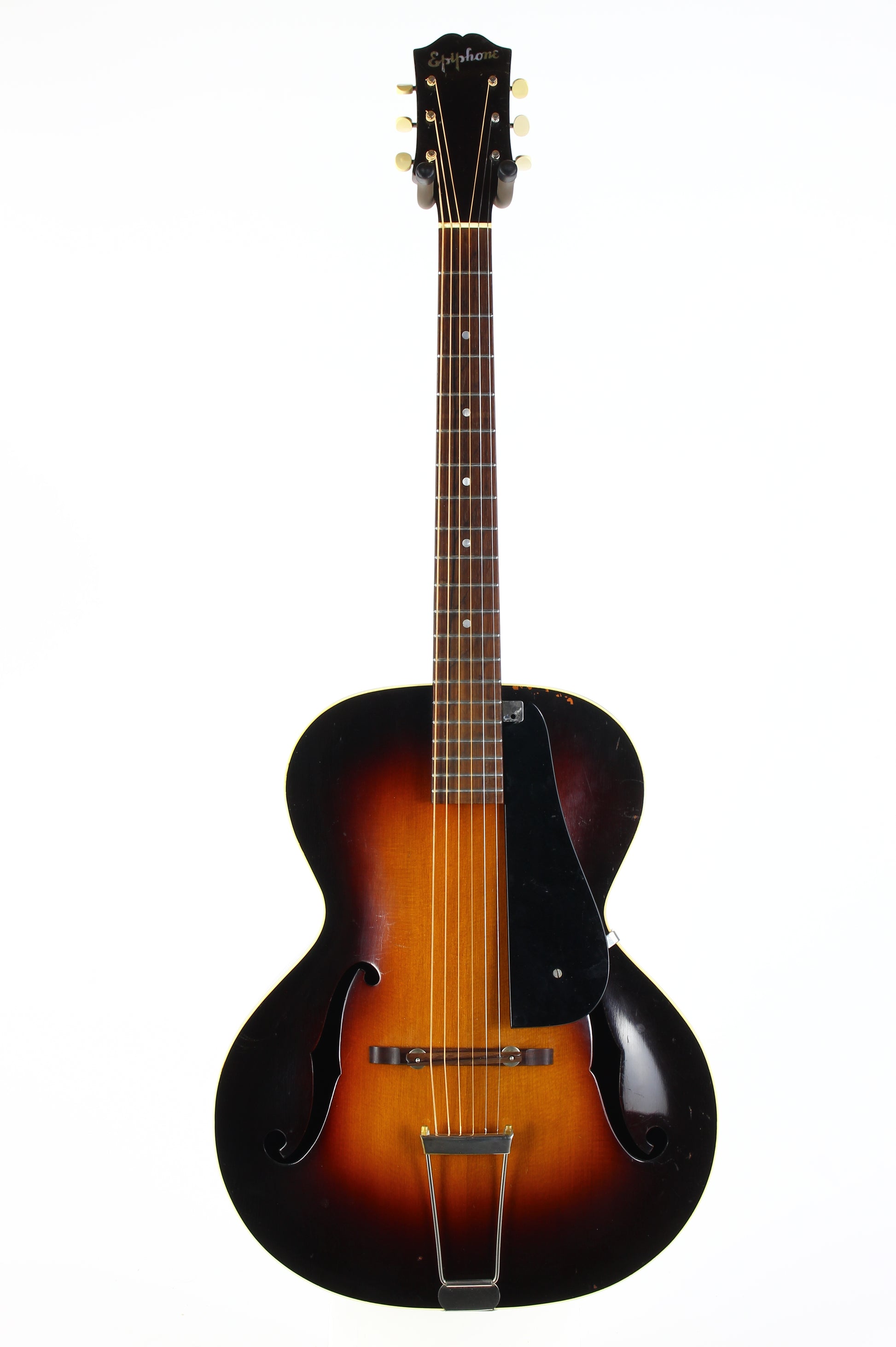 Here is a super clean 1939 Epiphone Olympic archtop guitar in sunburst. This one is a really nice honest guitar that you'd be surprised is coming up on 90 years old! While it's certainly not mint, it's in very good plus condition with only light wear marks as our photos will show. The pickguard has a missing piece on the corner. The guitar plays very well with good action and it's a woody open sound that is really pleasing. The guitar comes complete with the original hardshell case with makeshift leather handle, Wonderful vintage archtop from one of the great archtop builders of the time!
