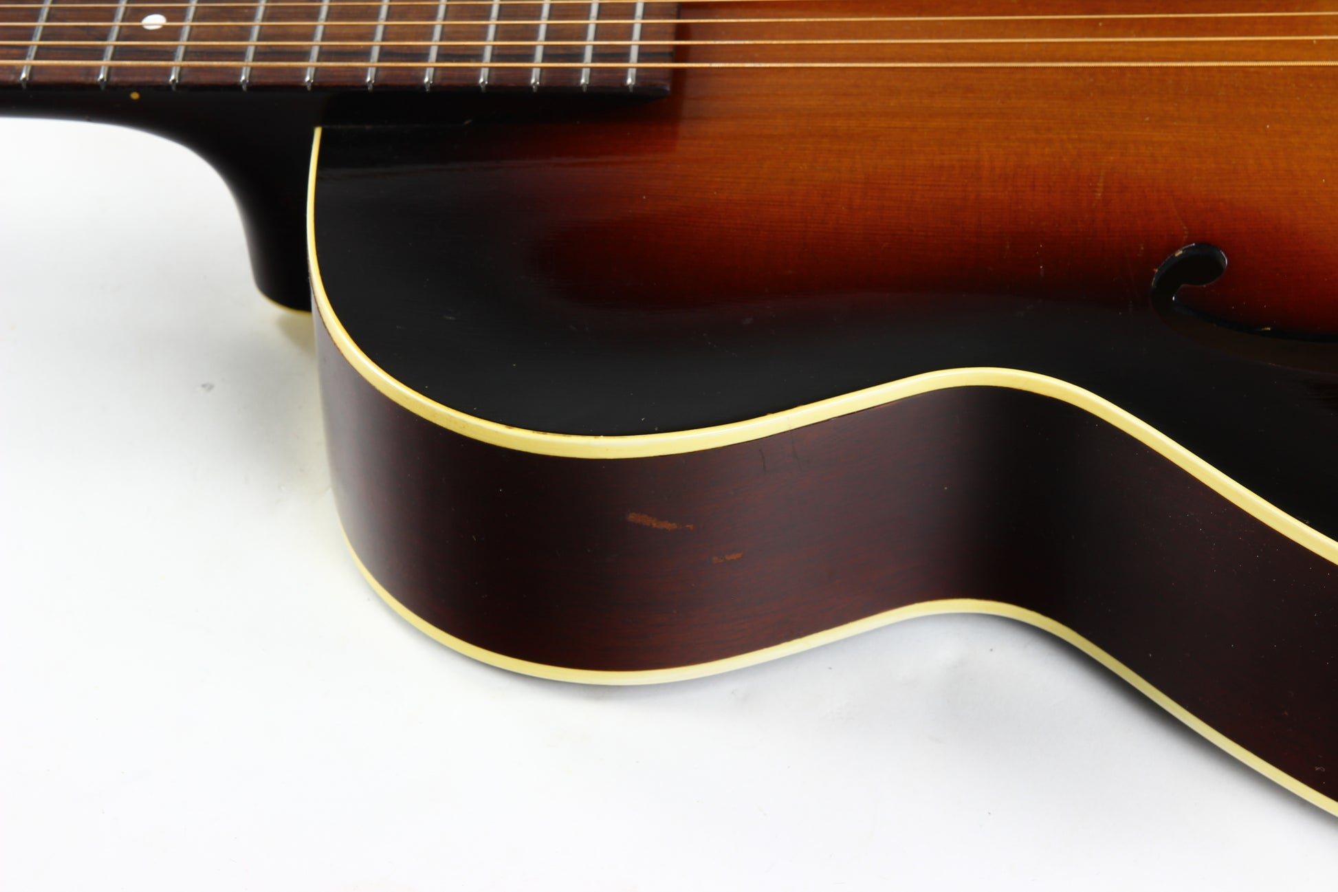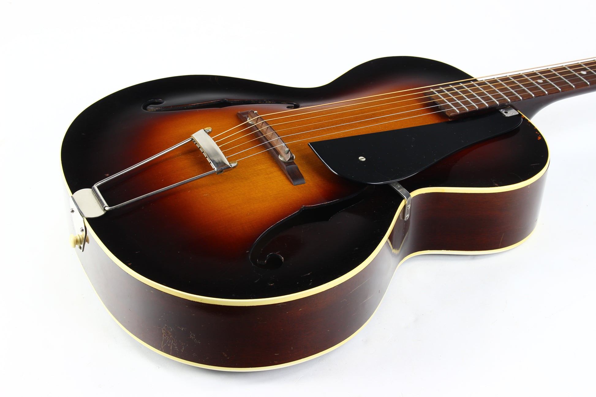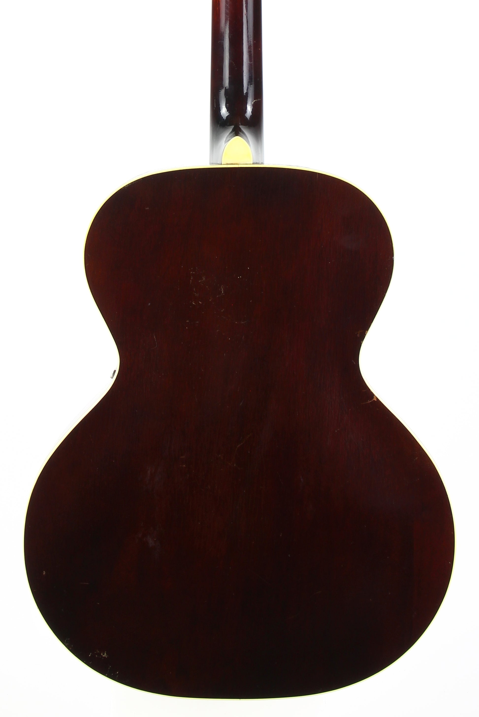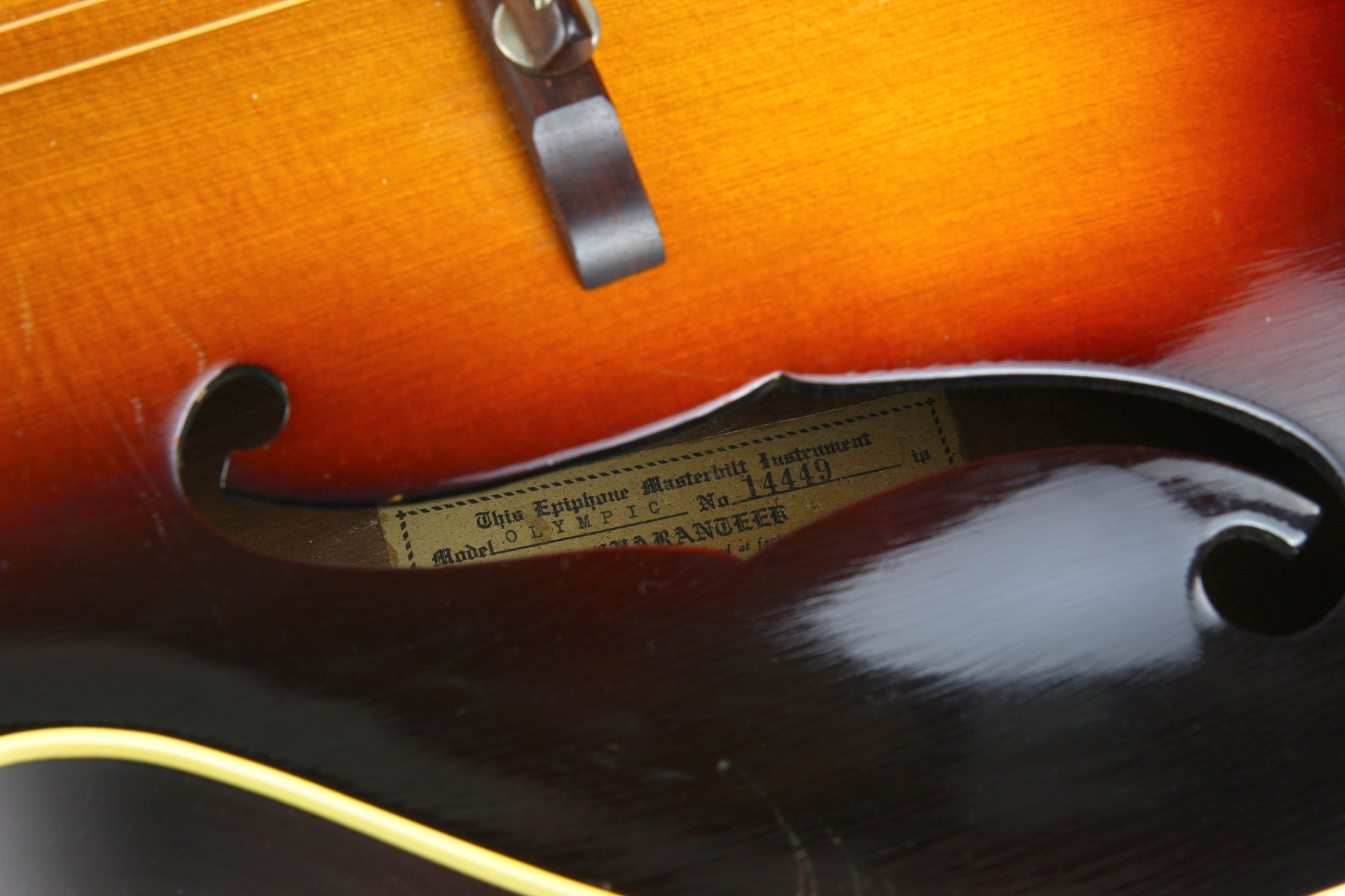 Here is a super clean 1939 Epiphone Olympic archtop guitar in sunburst. This one is a really nice honest guitar that you'd be surprised is coming up on 90 years old! While it's certainly not mint, it's in very good plus condition with only light wear marks as our photos will show. The pickguard has a missing piece on the corner. The guitar plays very well with good action and it's a woody open sound that is really pleasing. The guitar comes complete with the original hardshell case with makeshift leather handle, Wonderful vintage archtop from one of the great archtop builders of the time!