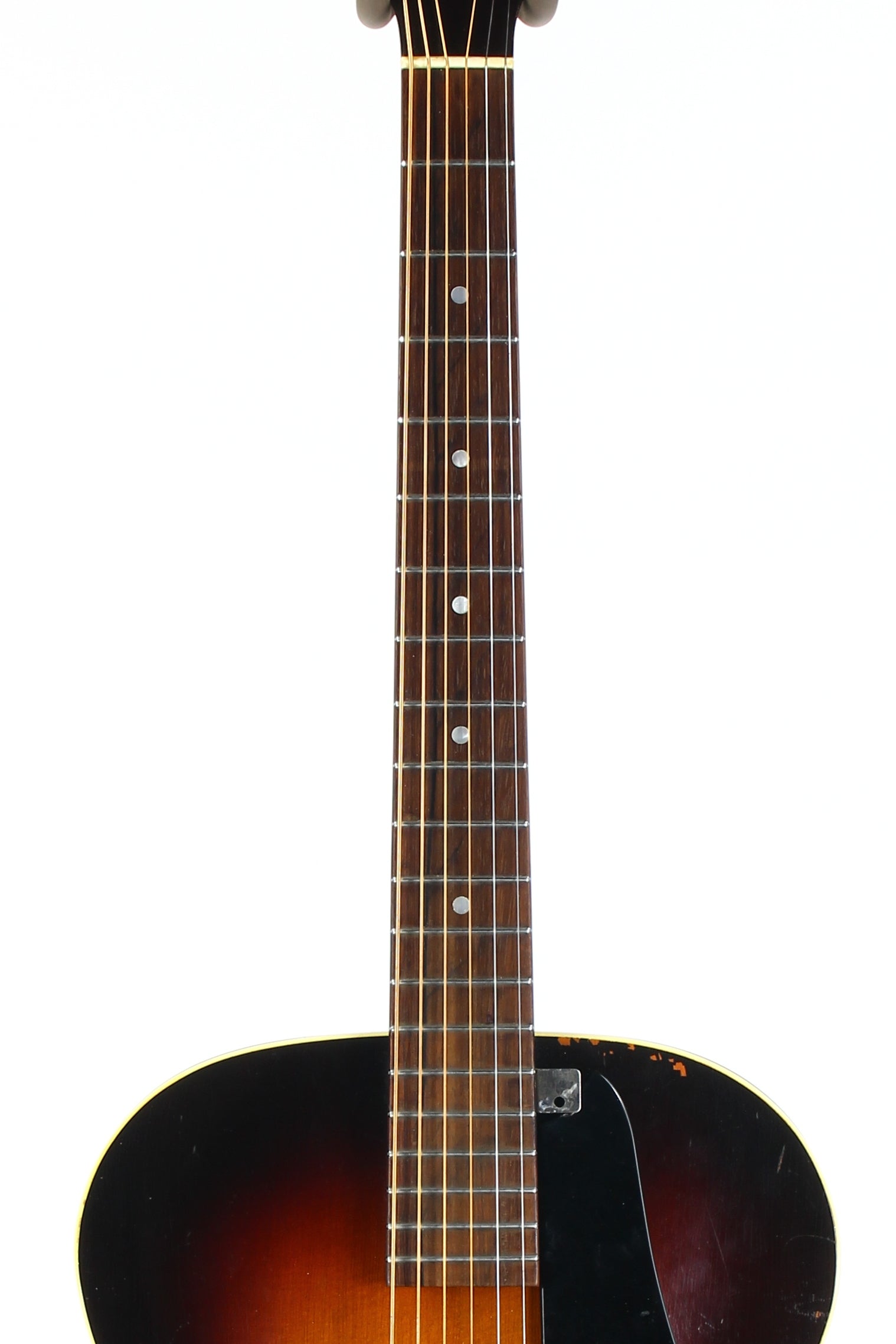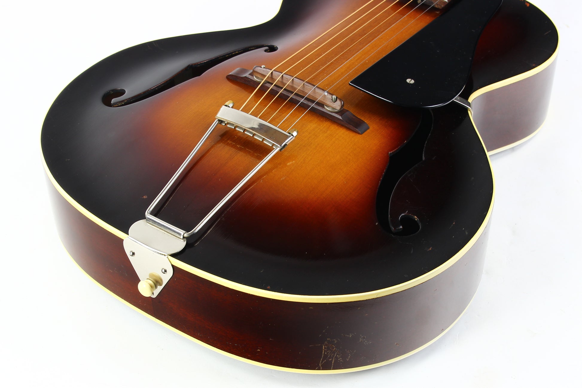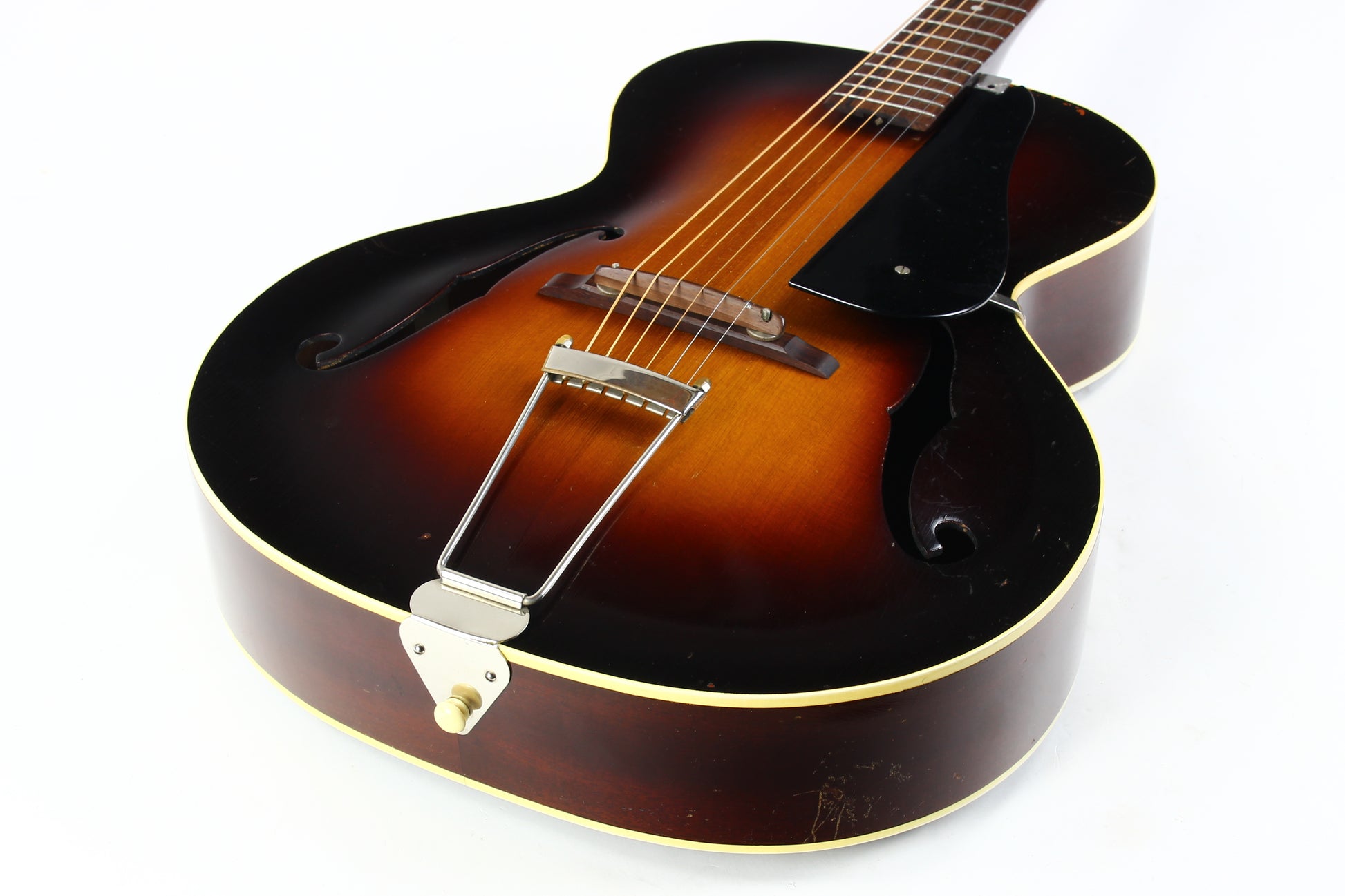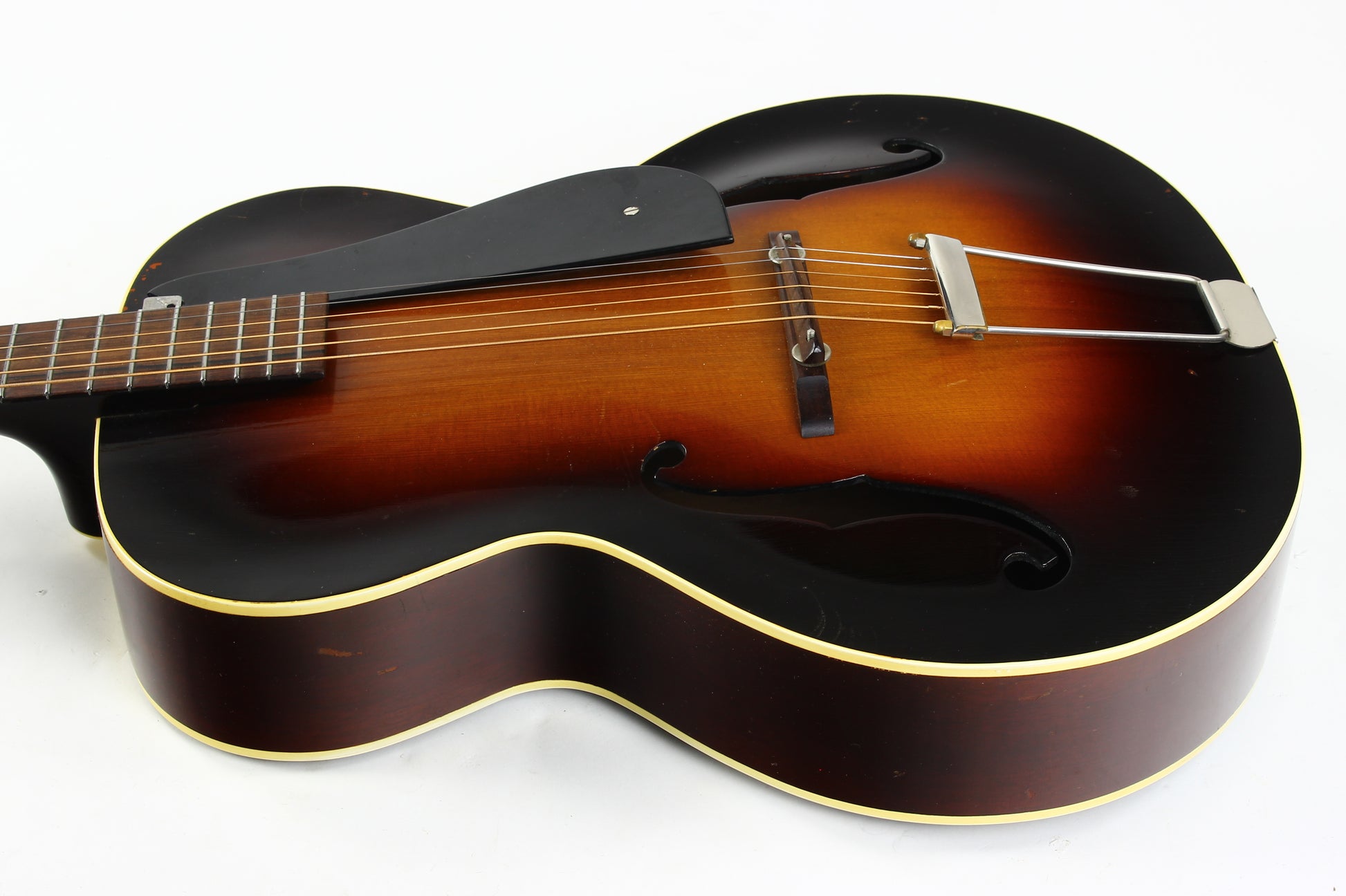 Here is a super clean 1939 Epiphone Olympic archtop guitar in sunburst. This one is a really nice honest guitar that you'd be surprised is coming up on 90 years old! While it's certainly not mint, it's in very good plus condition with only light wear marks as our photos will show. The pickguard has a missing piece on the corner. The guitar plays very well with good action and it's a woody open sound that is really pleasing. The guitar comes complete with the original hardshell case with makeshift leather handle, Wonderful vintage archtop from one of the great archtop builders of the time!