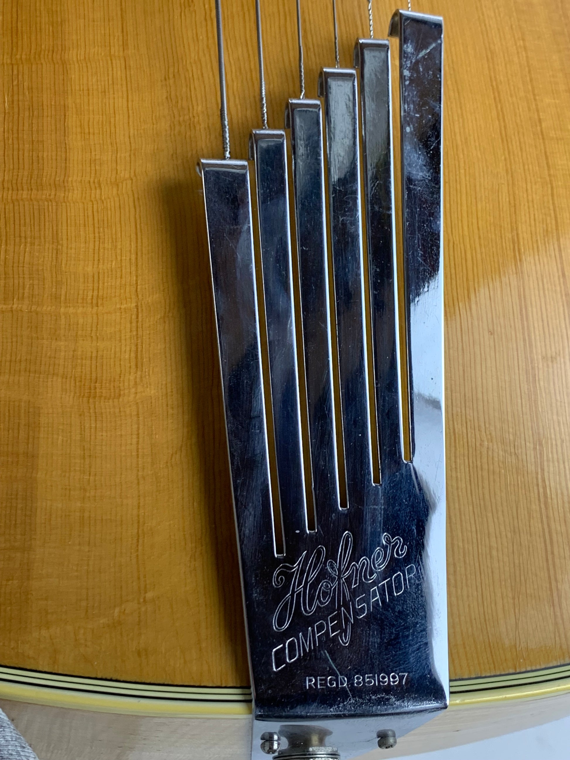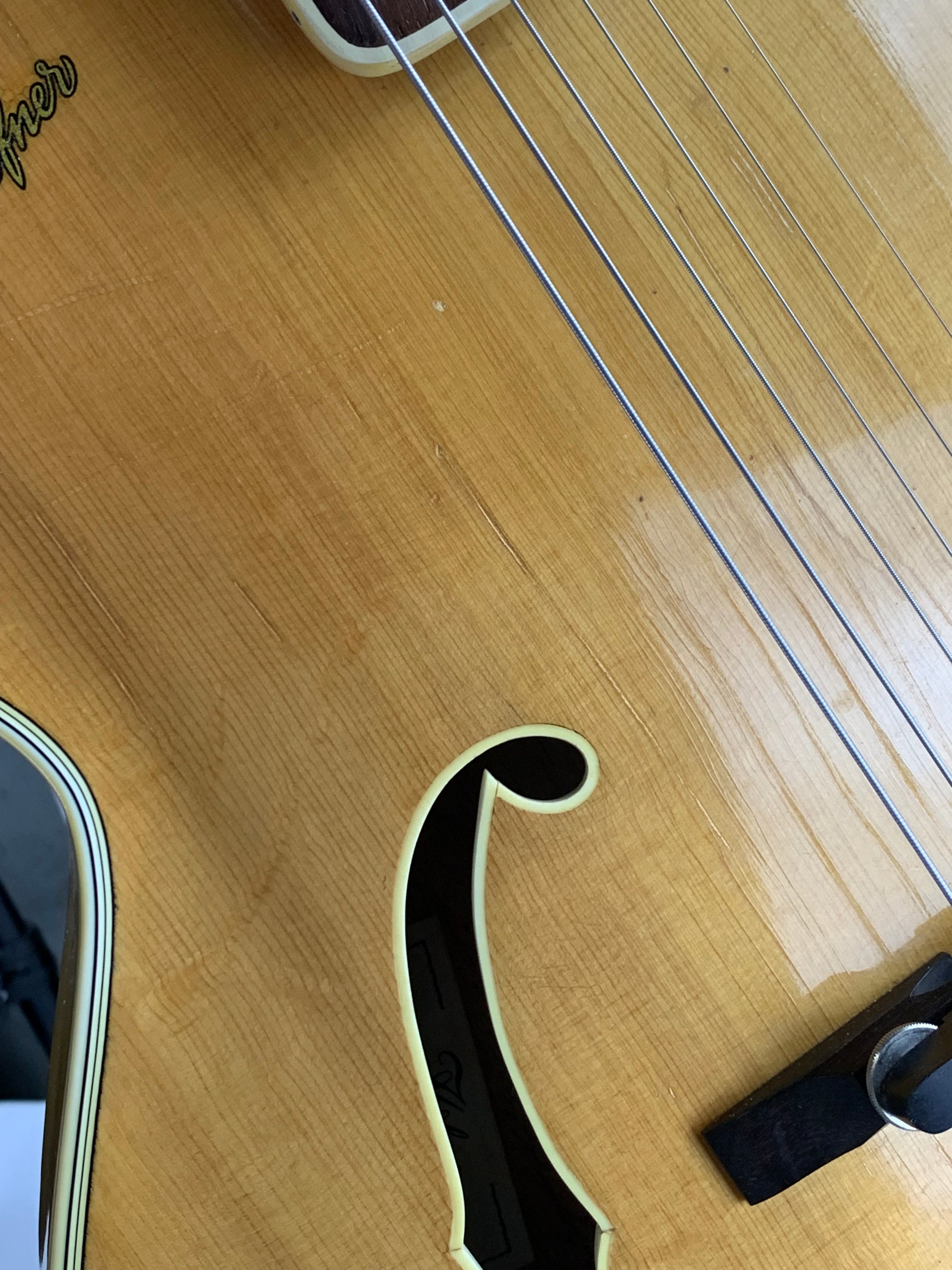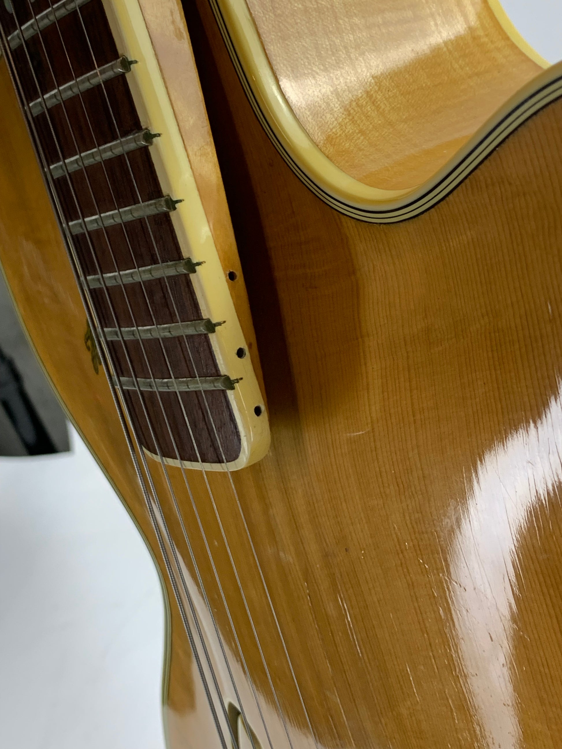 Condition: The guitar is pretty clean considering it’s 70 years old! Light dings and scratches all around. Nothing too bad. Still in very good plus condition. Action is low and it plays well. The bridge is not original and not the same radius so it would benefit from a correct bridge. It had a floating pickup at one point and the end pin jack is still present should you want to add one again. These didn’t have adjustable truss rods but the neck only has pretty minimal relief even with the flat wounds. Upgraded German Schaller tuners.