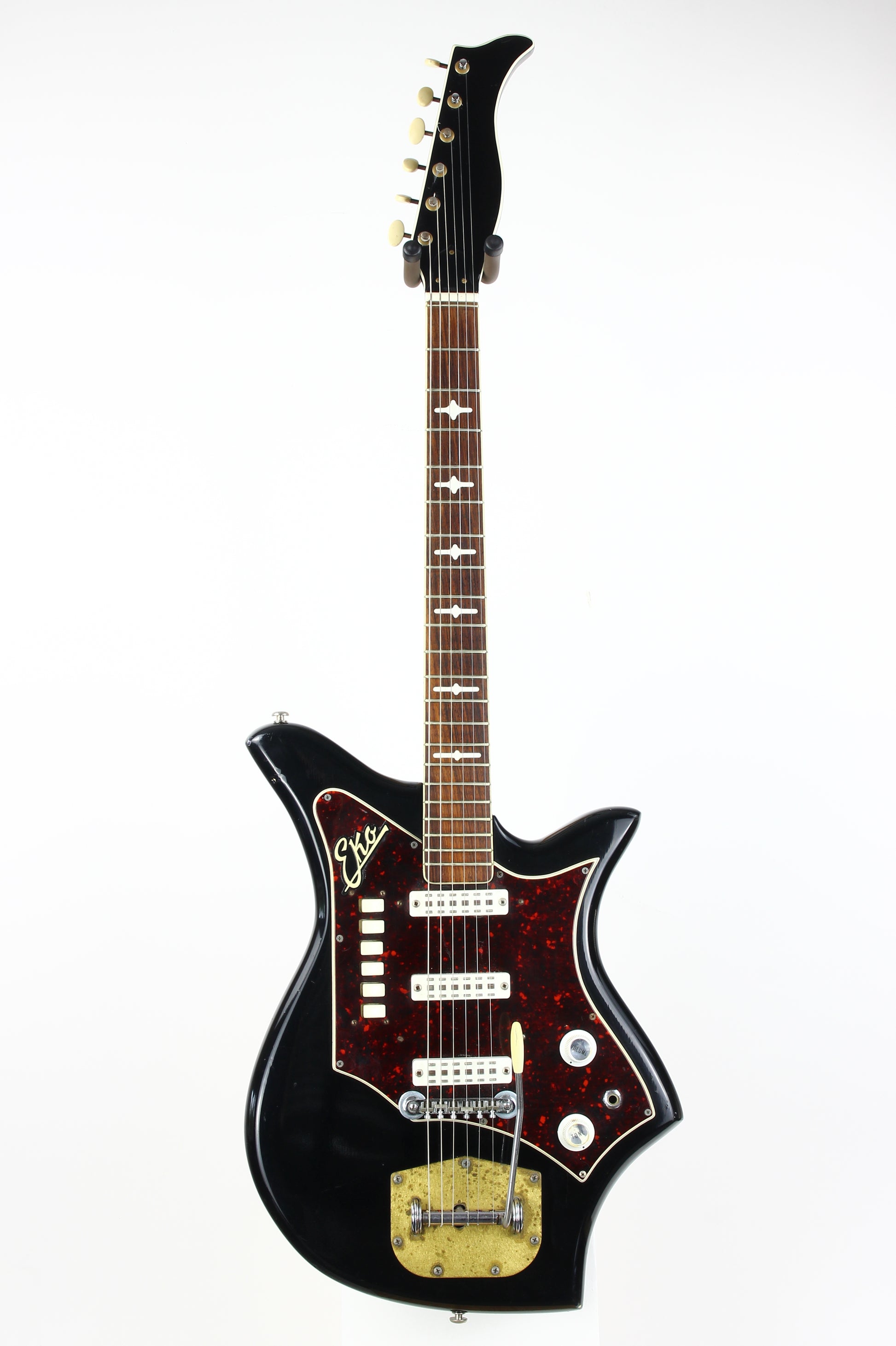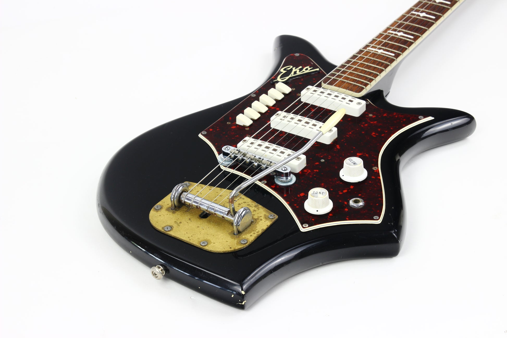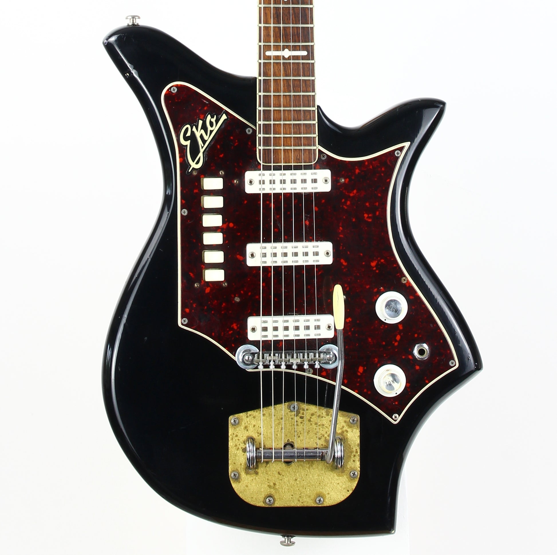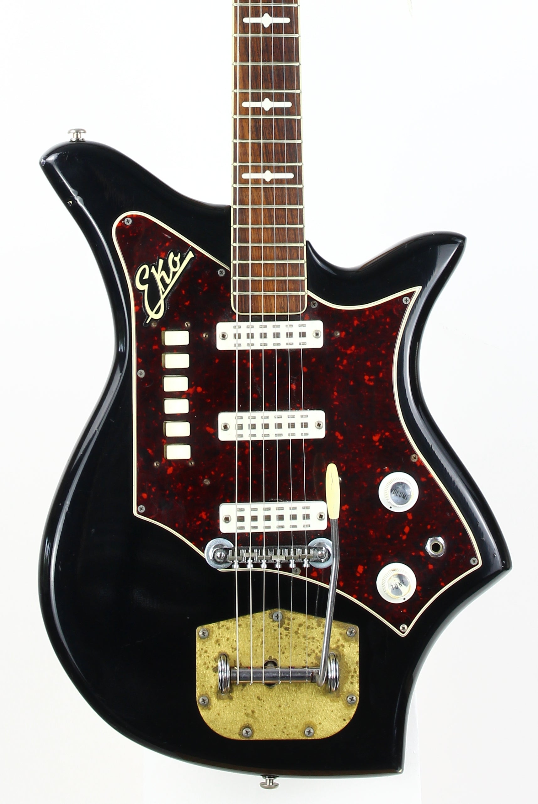 Here is a really cool and pretty rare BLACK Eko 700/V3. This is an Italian-made guitar from the early 60's. The 700 was their top model and this is the 3 pickup version. They also made a 4 pickup model 700/V4 and 2-pickup model 700/V2. The guitar is reasonably clean but being black it does show some scratches and light dings here and there. Please see photos for condition. The bridge, neck plate, and some pickguard screws are the only changes that we could find. Comes with a hard case and all the case candy as shown including original EKO tags! Plays easy and sounds great!
