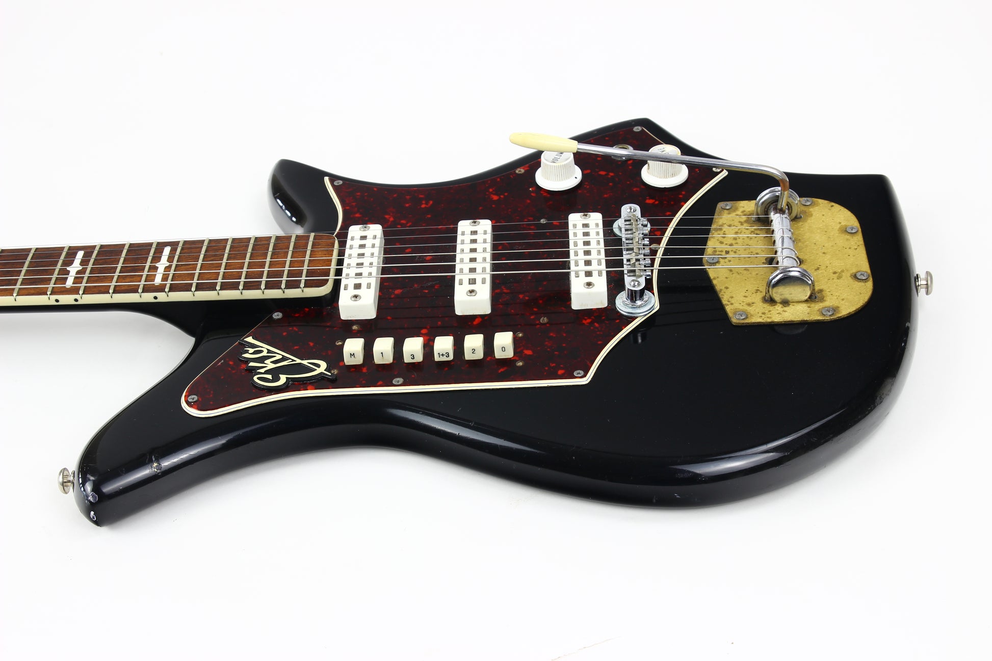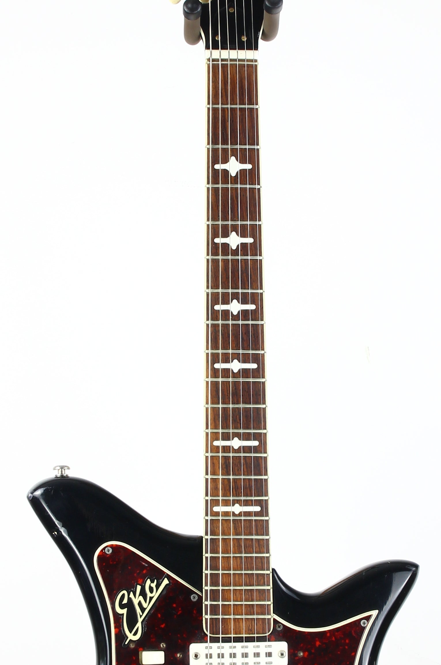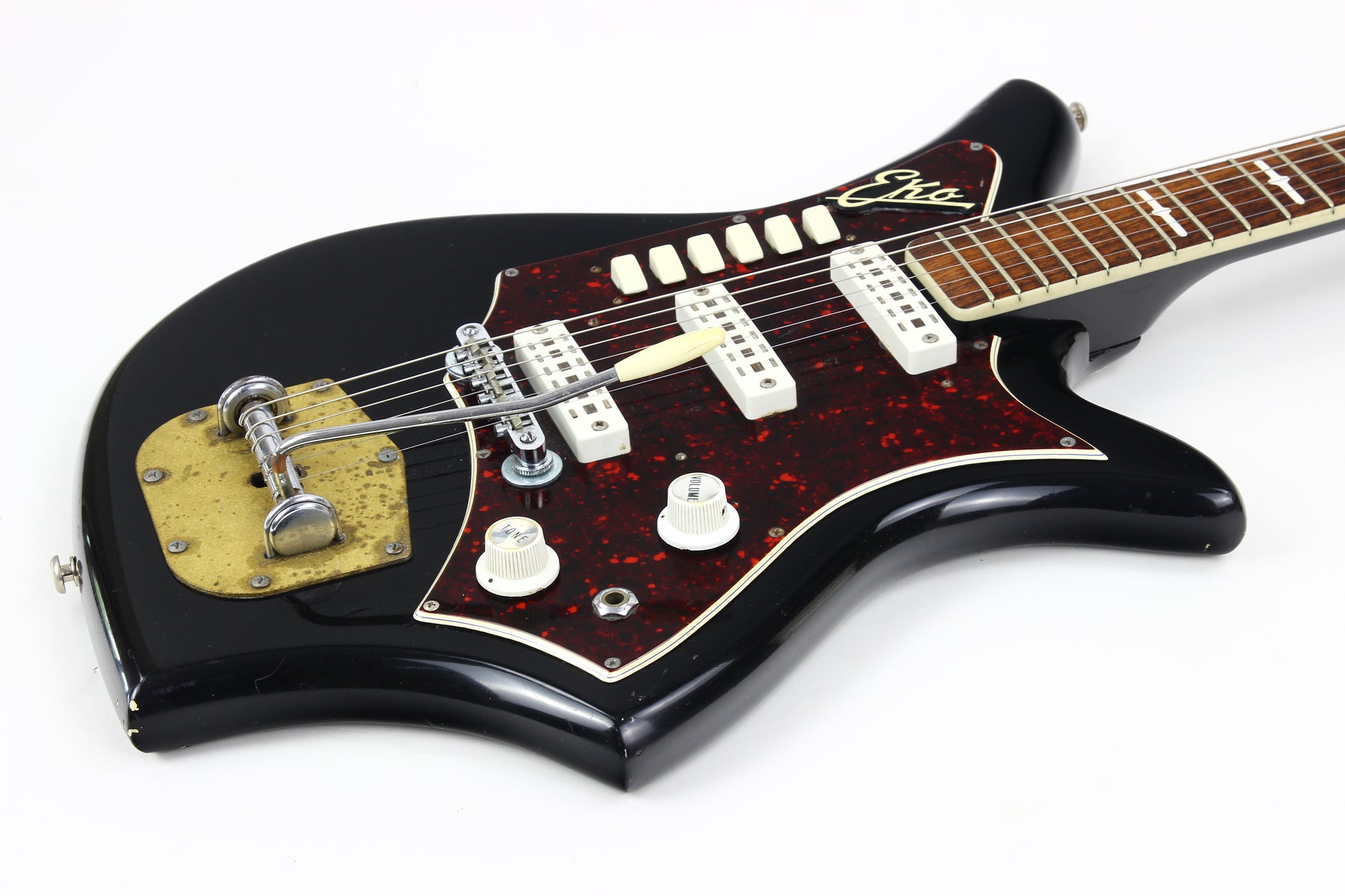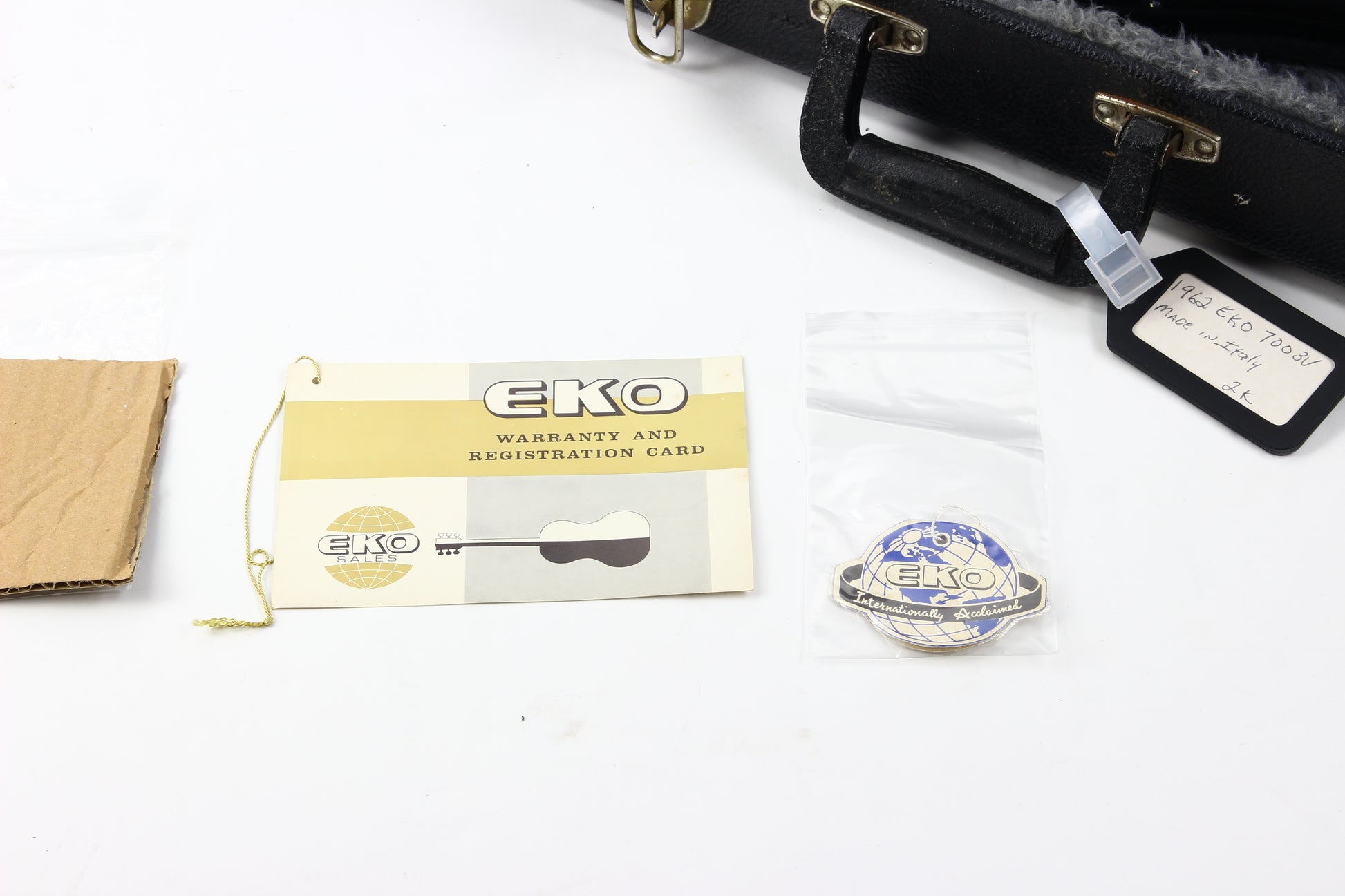 Here is a really cool and pretty rare BLACK Eko 700/V3. This is an Italian-made guitar from the early 60's. The 700 was their top model and this is the 3 pickup version. They also made a 4 pickup model 700/V4 and 2-pickup model 700/V2. The guitar is reasonably clean but being black it does show some scratches and light dings here and there. Please see photos for condition. The bridge, neck plate, and some pickguard screws are the only changes that we could find. Comes with a hard case and all the case candy as shown including original EKO tags! Plays easy and sounds great!