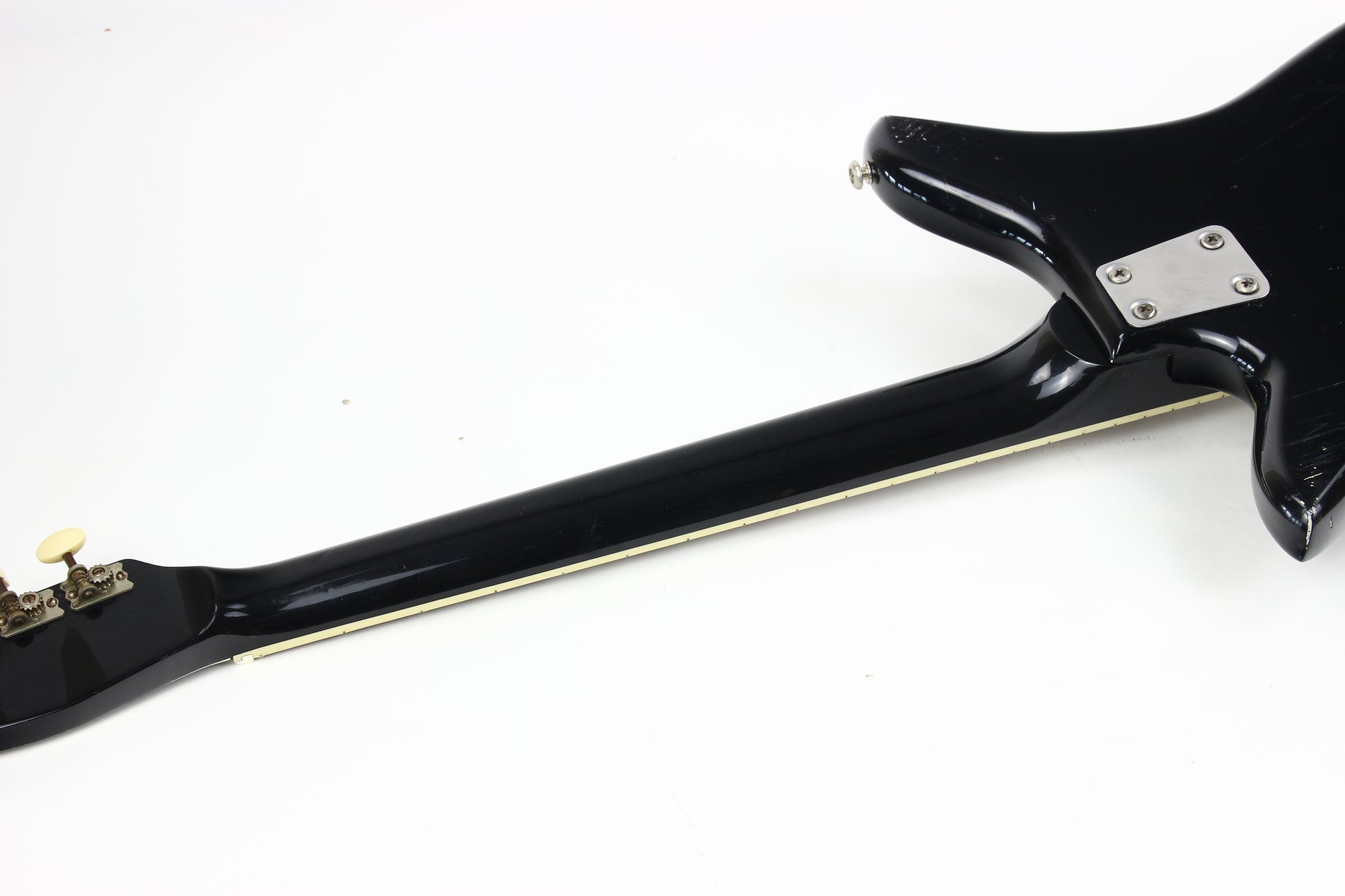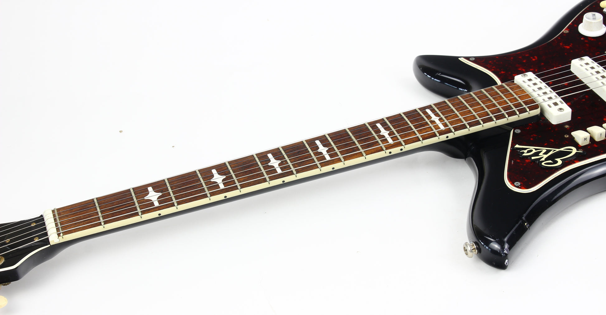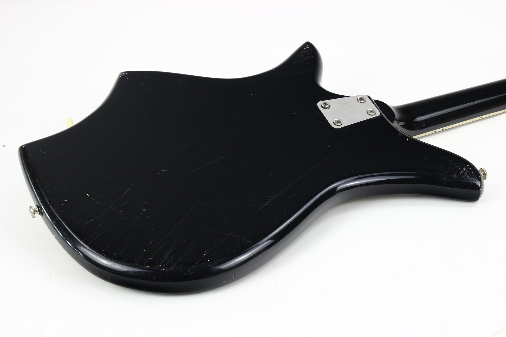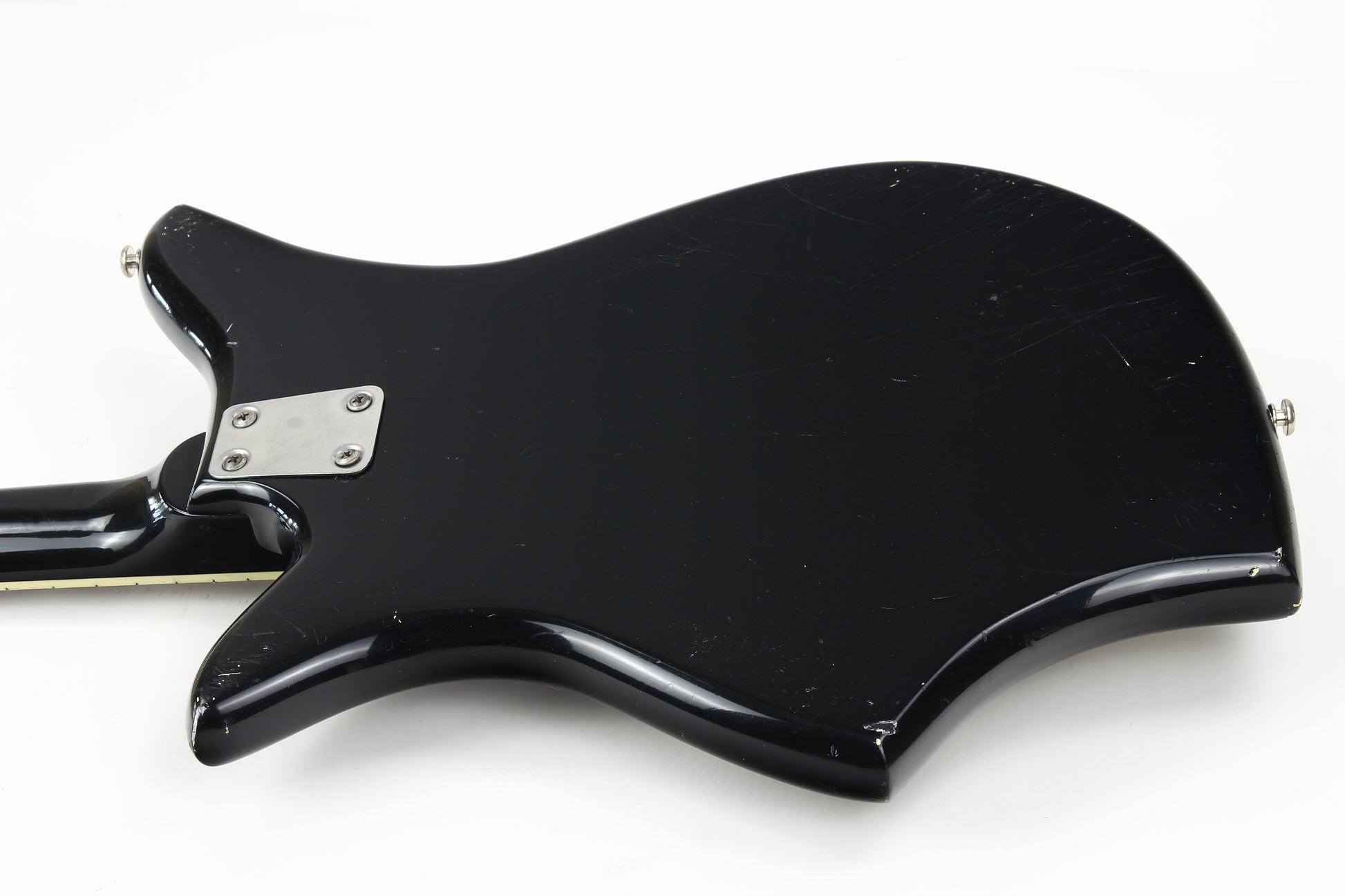 Here is a really cool and pretty rare BLACK Eko 700/V3. This is an Italian-made guitar from the early 60's. The 700 was their top model and this is the 3 pickup version. They also made a 4 pickup model 700/V4 and 2-pickup model 700/V2. The guitar is reasonably clean but being black it does show some scratches and light dings here and there. Please see photos for condition. The bridge, neck plate, and some pickguard screws are the only changes that we could find. Comes with a hard case and all the case candy as shown including original EKO tags! Plays easy and sounds great!