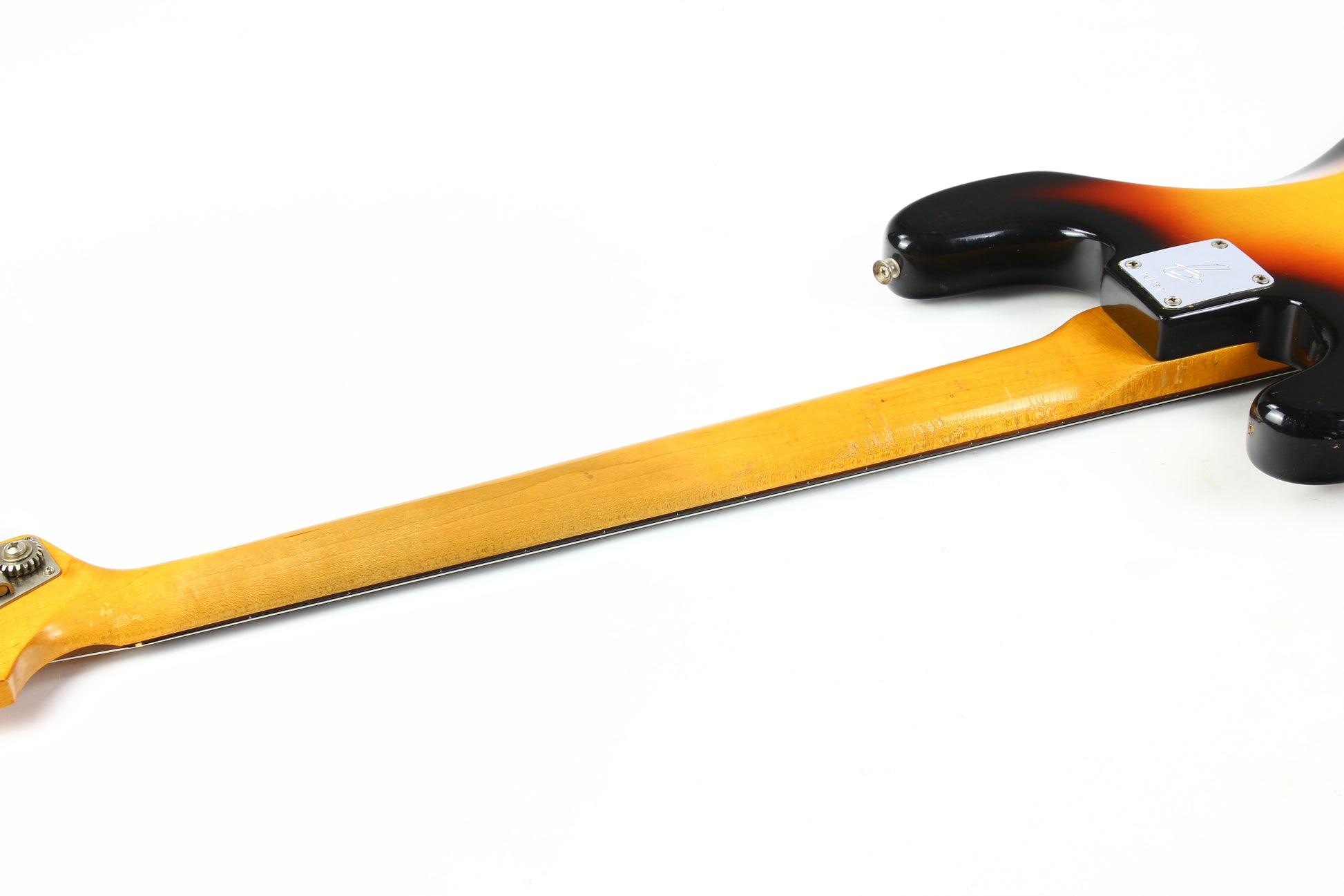 Here’s a great 1966 Fender Precision Bass in Sunburst that plays and sounds incredible. It’s all original except for the knobs, which are later Fender. The bass retains its original finish, though there are a few light touch-ups in the black—nothing unusual for mid-’60s Fenders and all shown in the photos.