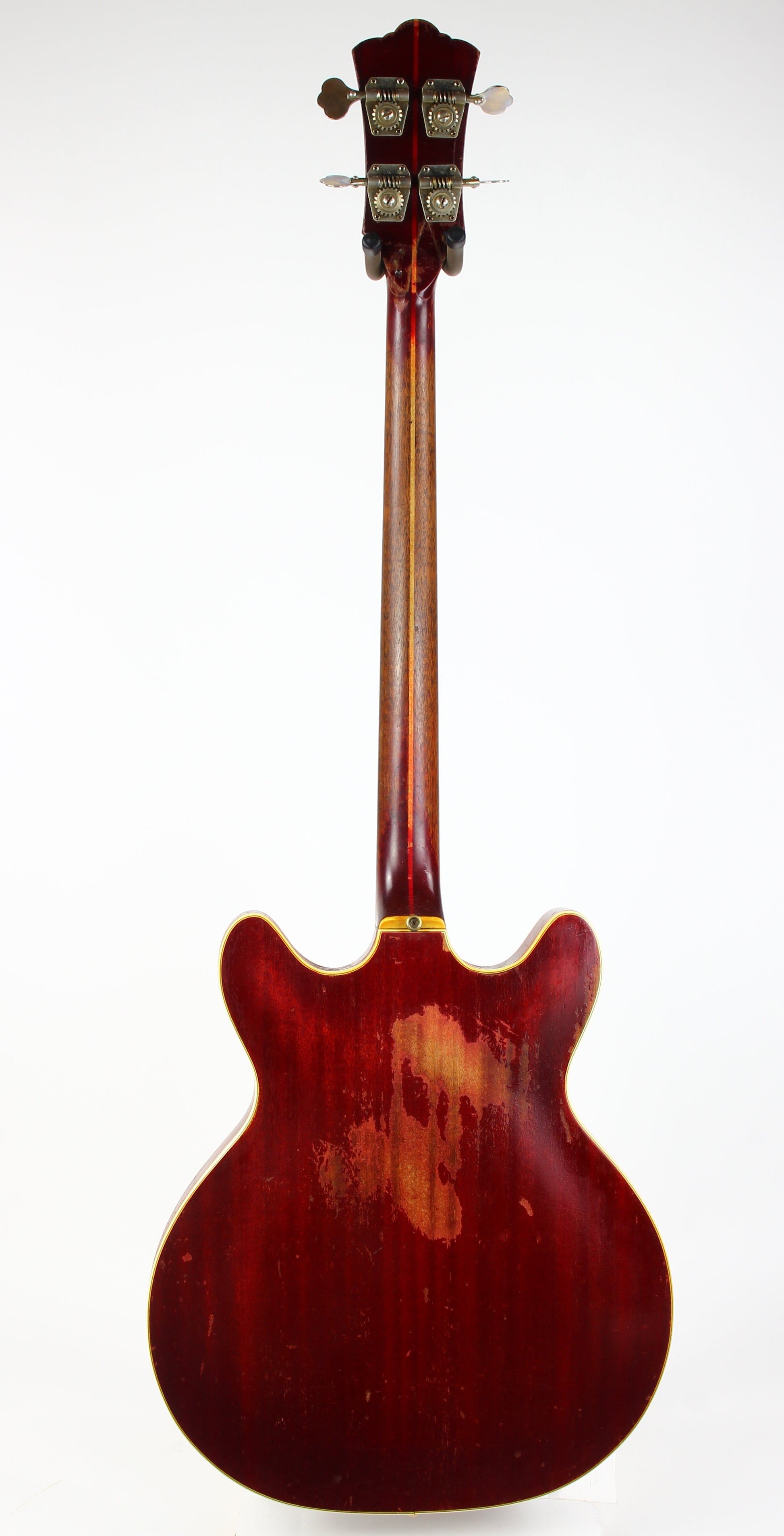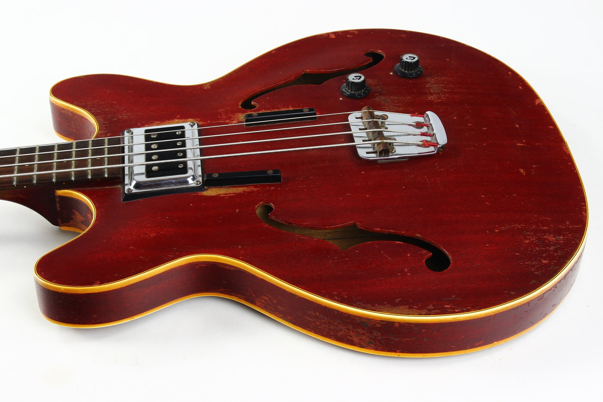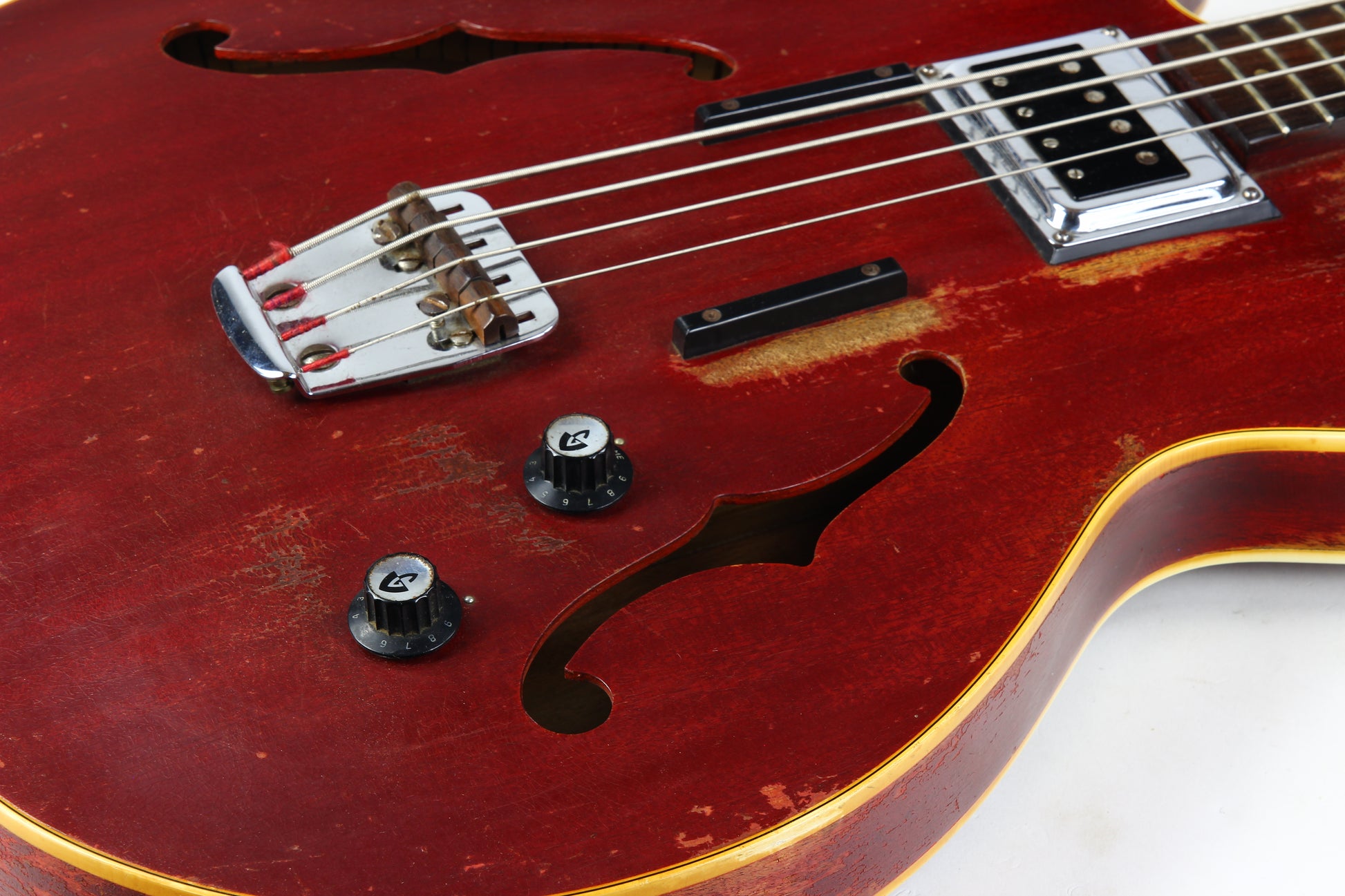 Here’s a cool 1967 Guild Starfire I in Cherry Red with the original Hagstrom/Guild Bi-Sonic pickup—and it absolutely roars. This one is firmly player-grade due to an old headstock repair, but it’s stable, functional, and has clearly been holding up well for decades.