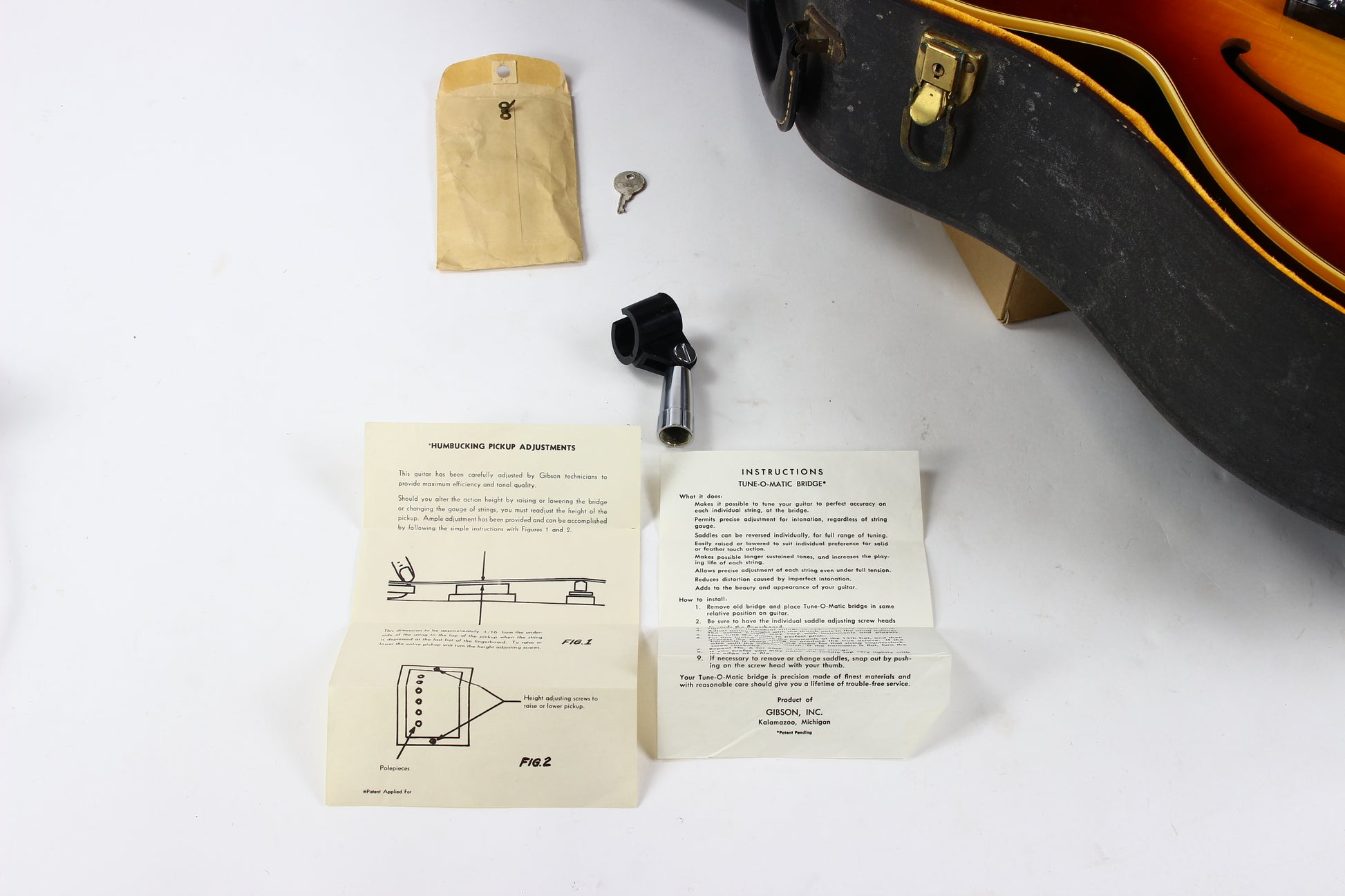Here is an incredibly clean 1968 Gibson ES-175D in sunburst! Only year for the Gibson logo on the pickguard. Even some light figuring on the top which is rare. The guitar is all original with no changes except the very cool Mono-Plak truss rod cover that Gibson offered for their customers. If you don't want this cover, we can include an original late 60's one. Comes with the original case with lots of case candy including the case key and paperwork. The guitar is an easy 9.25/10. Just some light surface marks and light finish checking in a few spots. Ultra clean overall. Plays easy and sounds great! 1-9/16" nut width. The Patent Number sticker humbuckers sound awesome as usual...