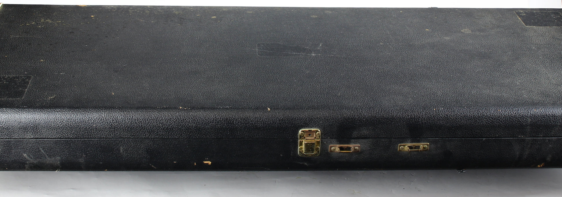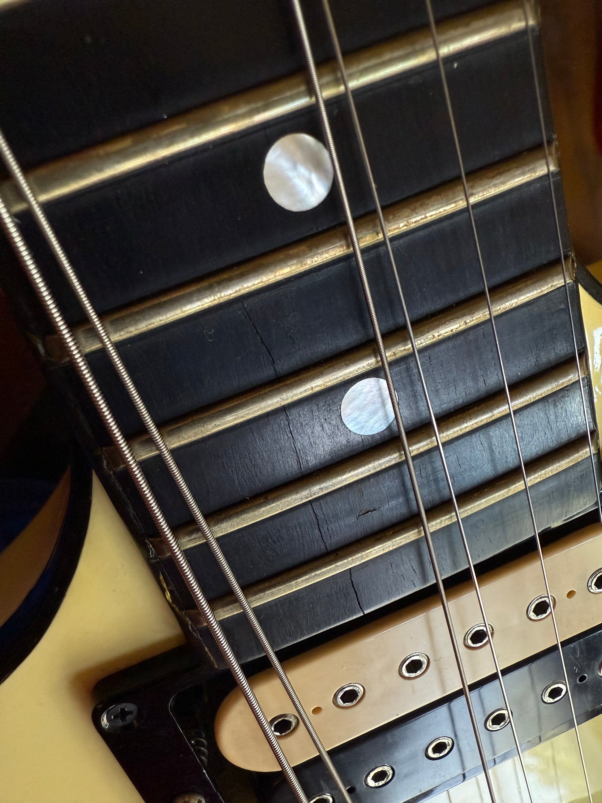 Condition: Super clean overall. Excellent condition. There are light marks and light dings in a few spots as shown but very nice. There is a very minor split on the end of fingerboard. Original case has 2 replaced latches and no handle. Beautiful example in a rare color.