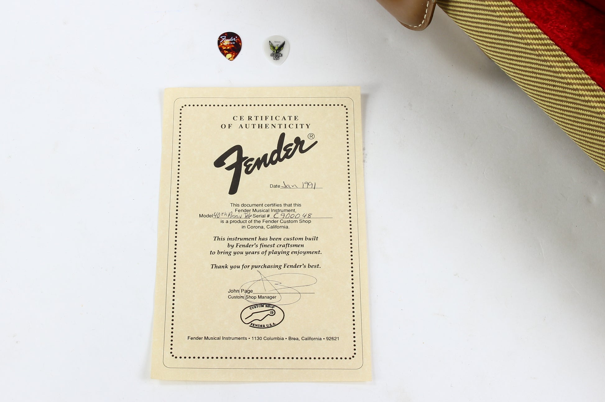 Here is a beautiful and desirable Fender Custom Shop 40th Anniversary Telecaster flametop in red. Keith Urban is famous for playing these. Very nice model. This one is pretty minty with the exception of a stray mark here and there. There is some red in the binding from when Fender didn't mask off the binding well. We've seen others from this run with the same thing. This is from Fender and not a wear or condition problem. The guitar comes with the original hard case, COA, as shown. Plays great and sounds amazing! Really fun guitar!