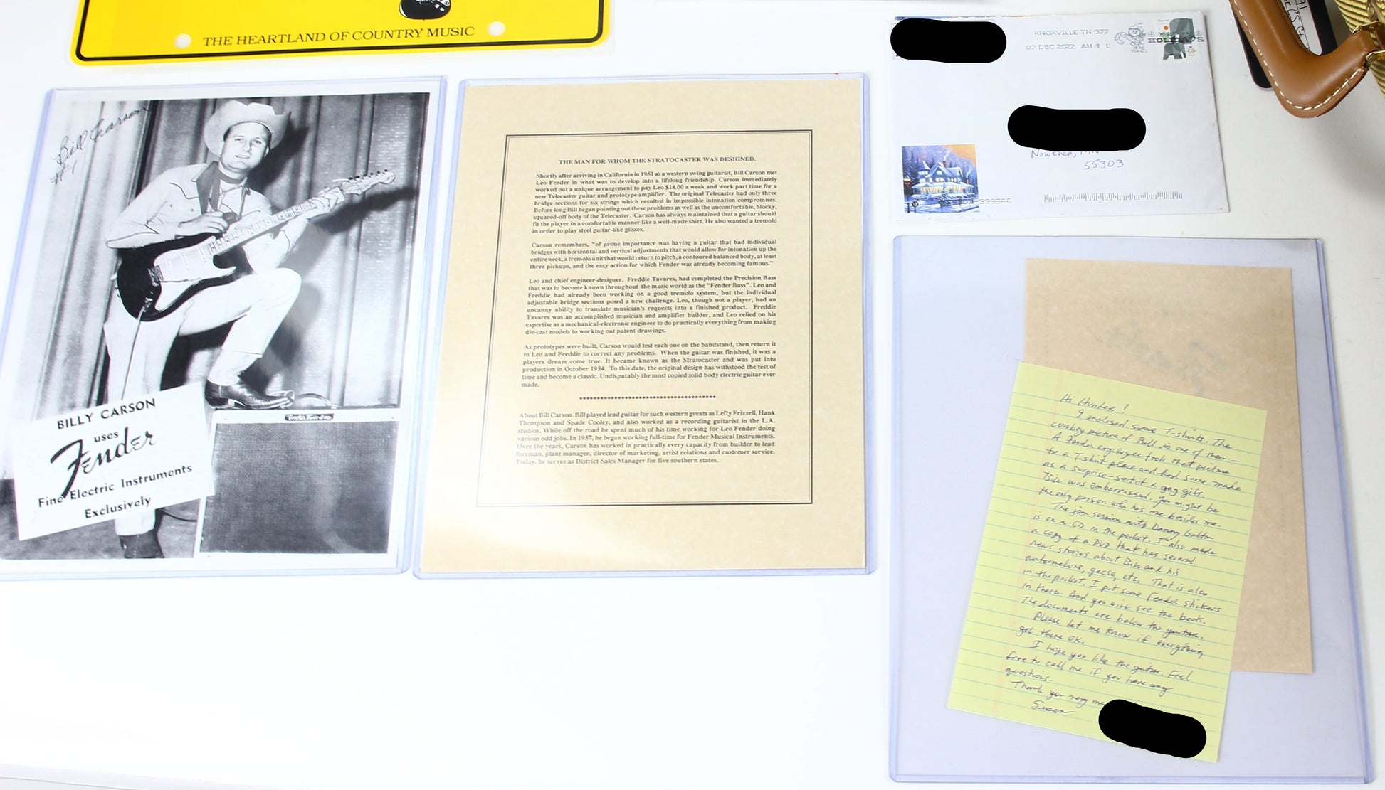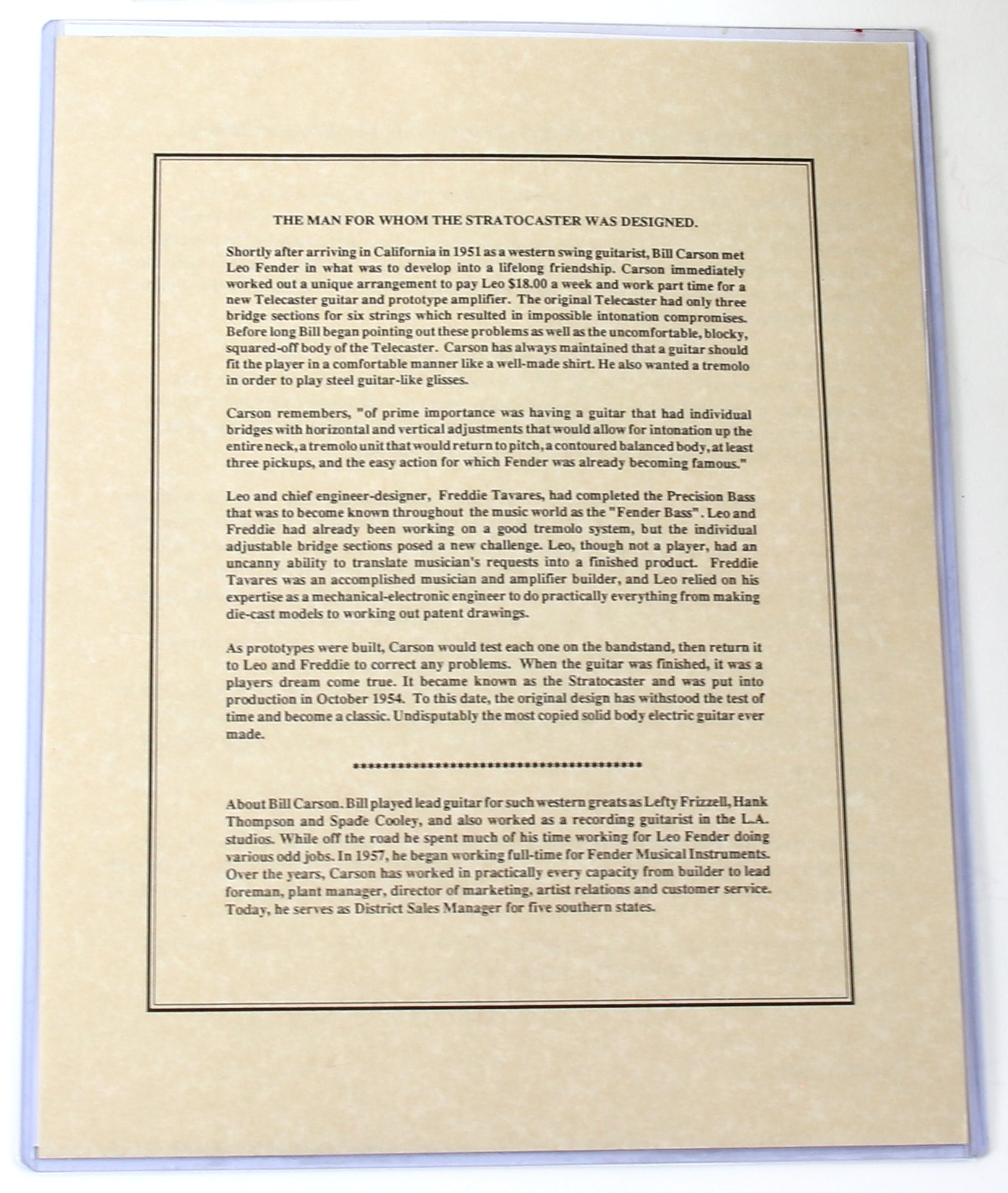 Here is a special piece of Fender Custom Shop history! The original Bill Carson Cimarron Red Strat owned, played, and signed by the man himself. Number 1 of the entire run from the personal collection of Bill Carson. The birdseye/flame/quilt maple neck is stunning. It has to be one of the most figured necks you'll ever find. The condition is also excellent. Basically no signs of wear. Comes with the original hard case, COA, Bill Carson book, and all the case candy as shown. Also included are letters from Susan Carson. Really an exceptional piece for any collector of Fender history. Plays easy and sounds great!