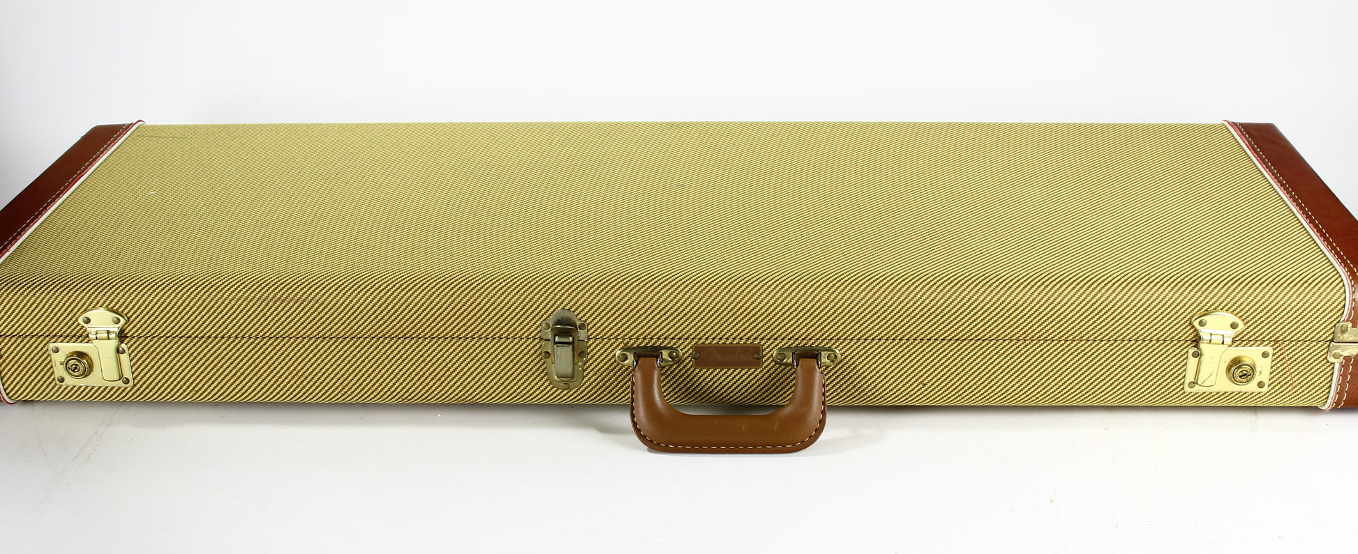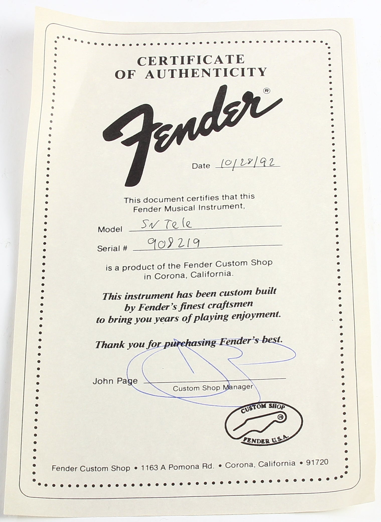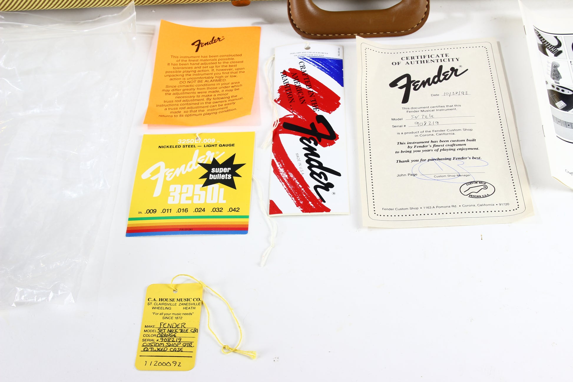 The finish according to Fender is SOT (Sunset Orange Transparent) but is in between orange and red. Really beautiful guitar. The guitar is in excellent plus condition overall. A few light surface marks but very nice overall for over 30 years old. Comes with the original hardshell case, COA, tags, and other paperwork as shown. Great opportunity to get a rare piece of early Fender Custom Shop history.