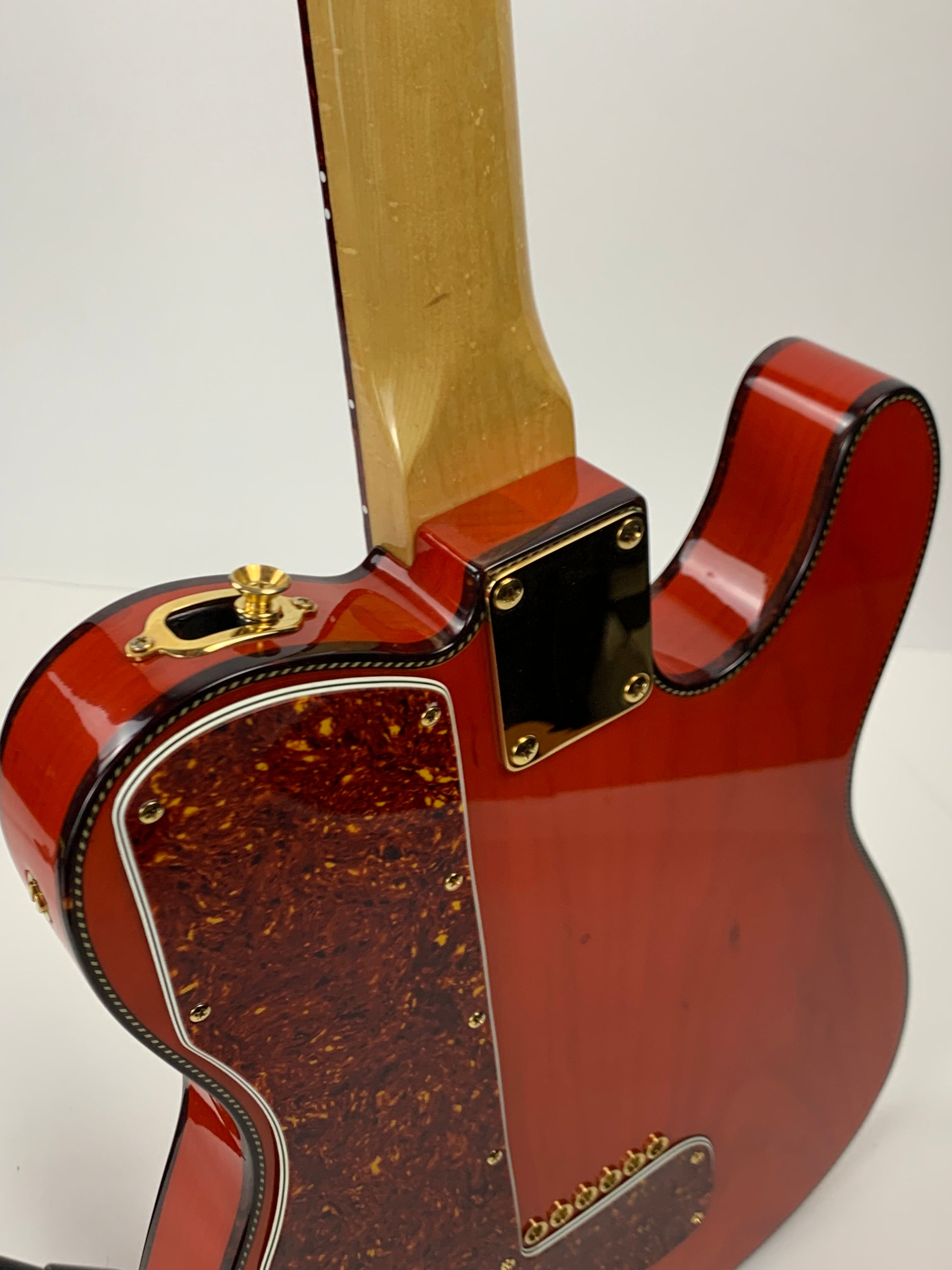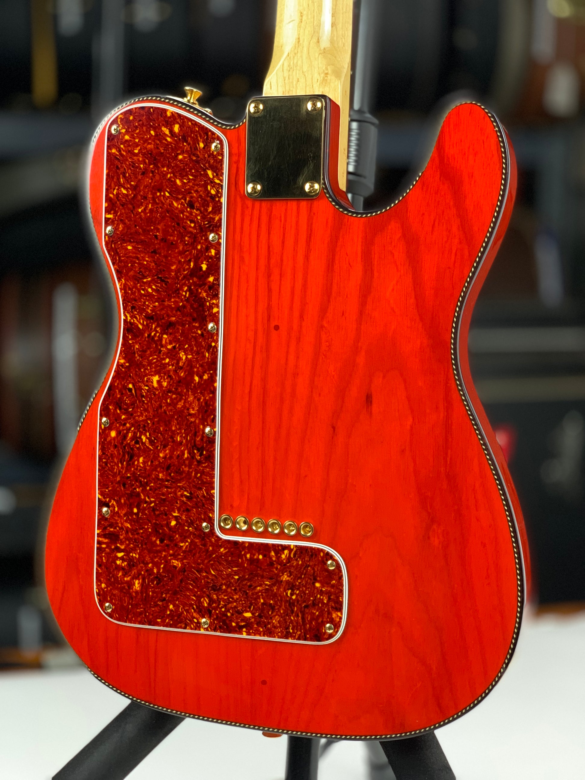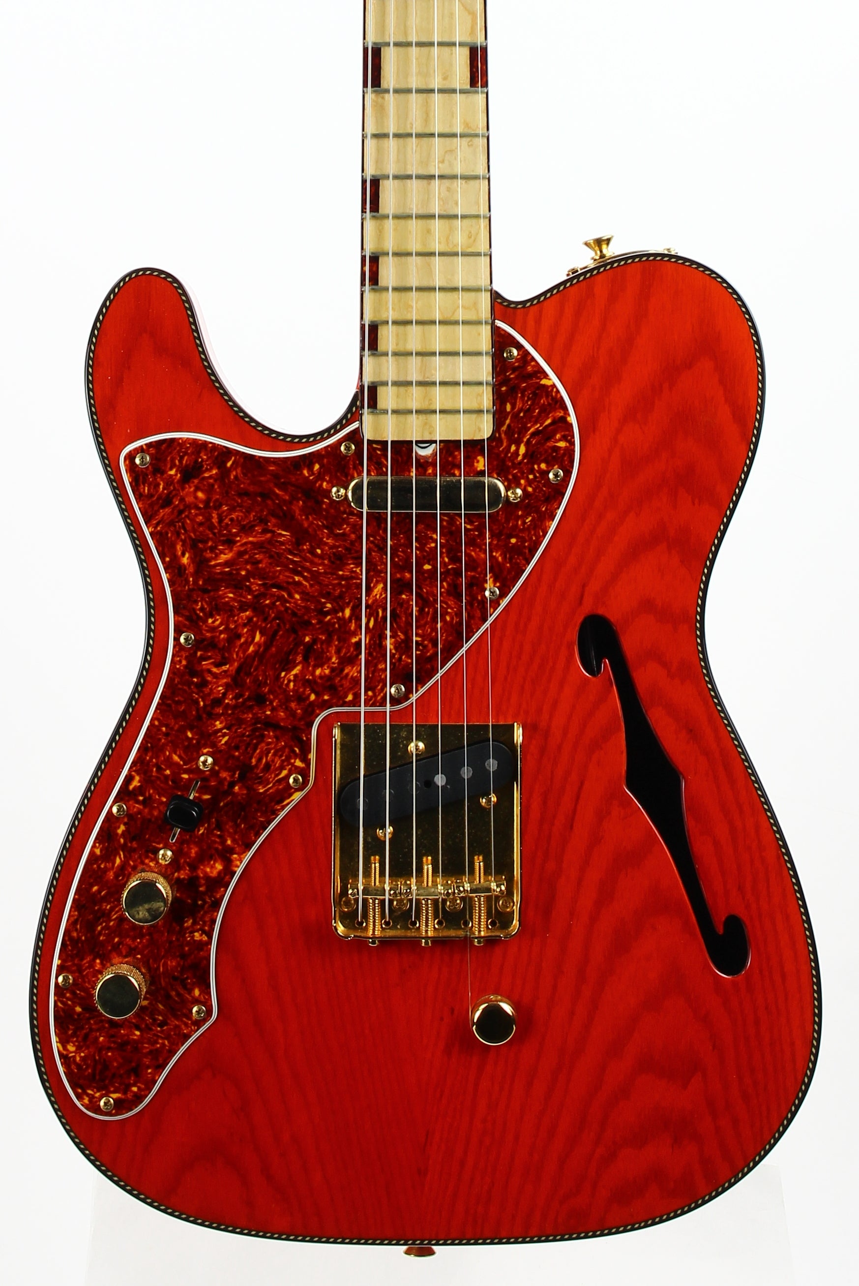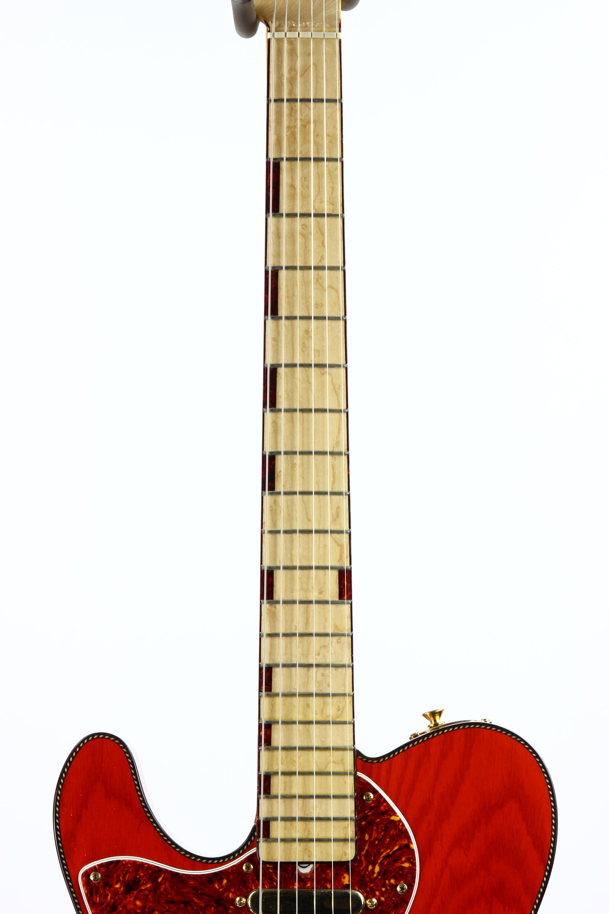 Beautiful double-bound Fender Custom Shop Masterbuilt Telecaster Thinline by early Fender master builder Fred Stuart. This tele features a load of custom appointments including double bound body with rope tortoise binding, B-Bender, transparent orange finish, Birdseye maple neck with unique tortoise inlays, dots on both sides of the fingerboard, gold hardware etc. One of the finest and unique early Fender Custom Shop Masterbuilts you’ll ever encounter.