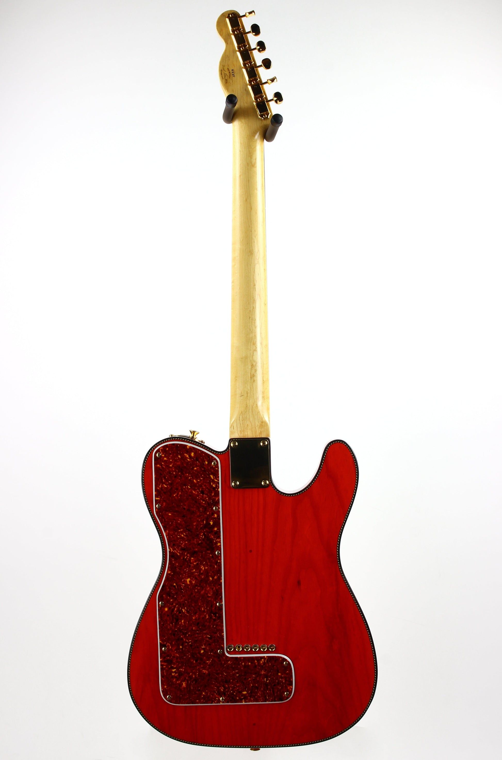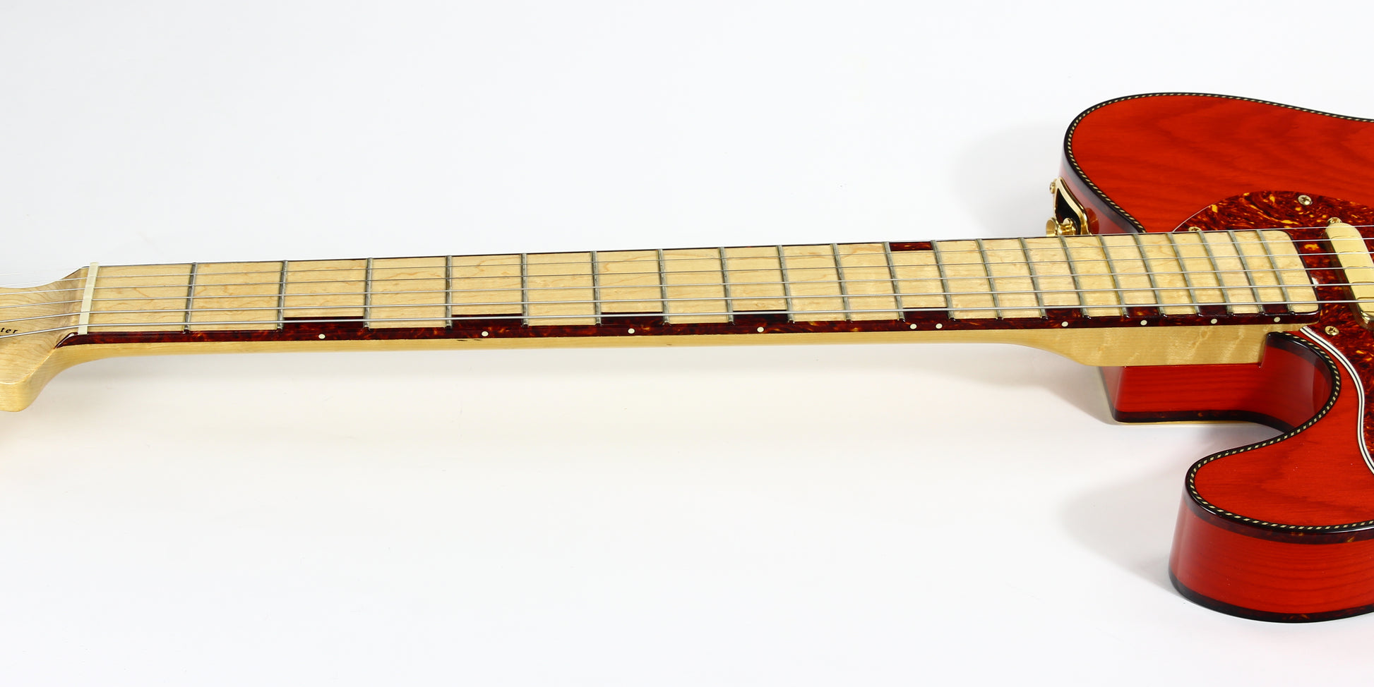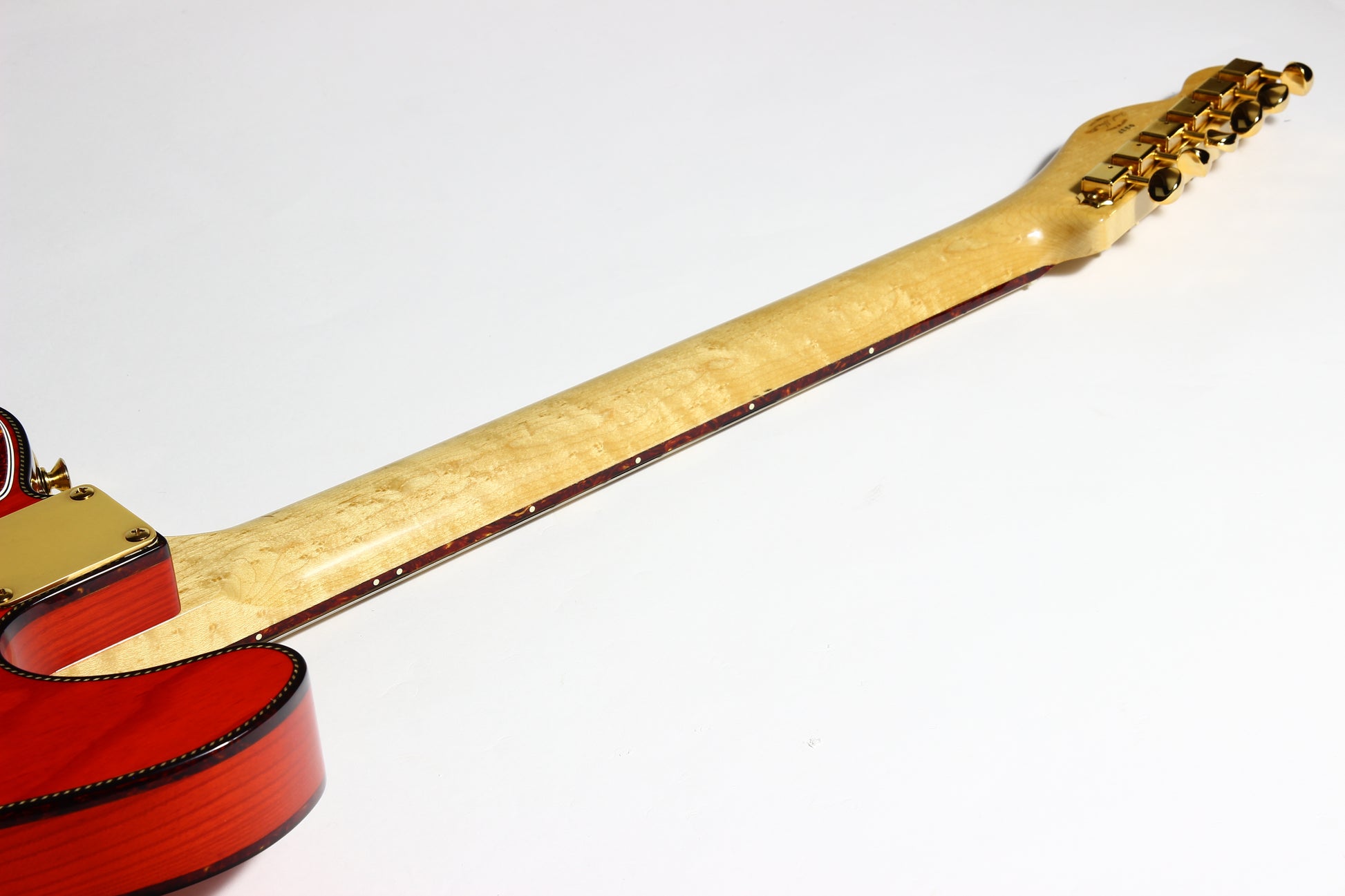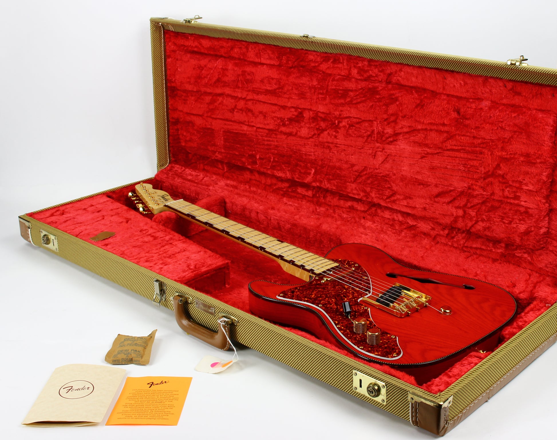 Beautiful double-bound Fender Custom Shop Masterbuilt Telecaster Thinline by early Fender master builder Fred Stuart. This tele features a load of custom appointments including double bound body with rope tortoise binding, B-Bender, transparent orange finish, Birdseye maple neck with unique tortoise inlays, dots on both sides of the fingerboard, gold hardware etc. One of the finest and unique early Fender Custom Shop Masterbuilts you’ll ever encounter.