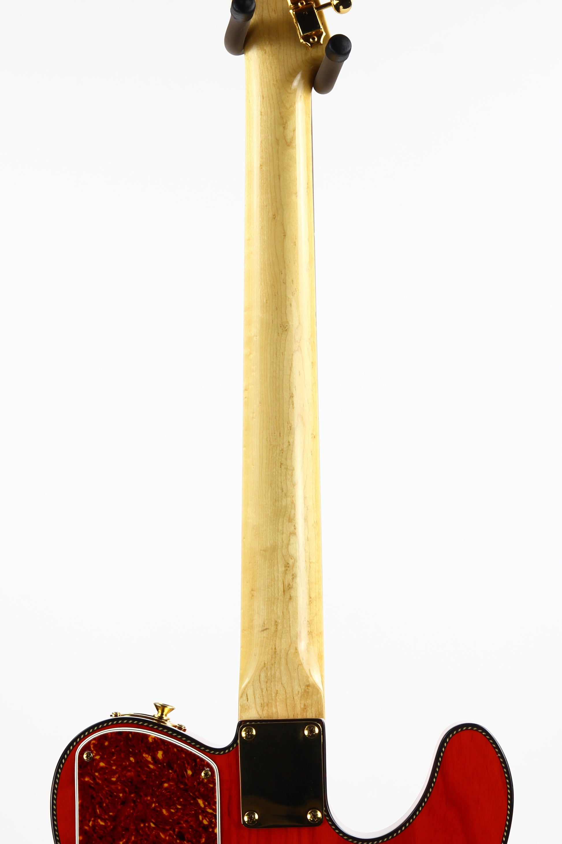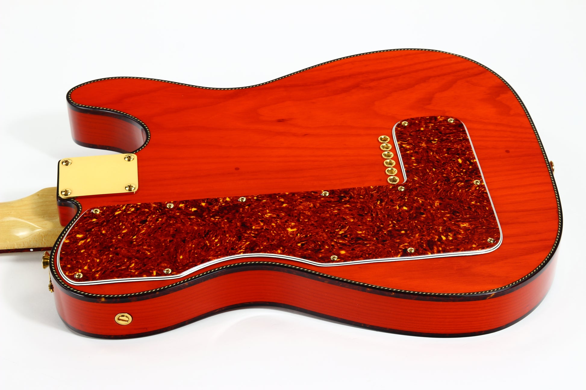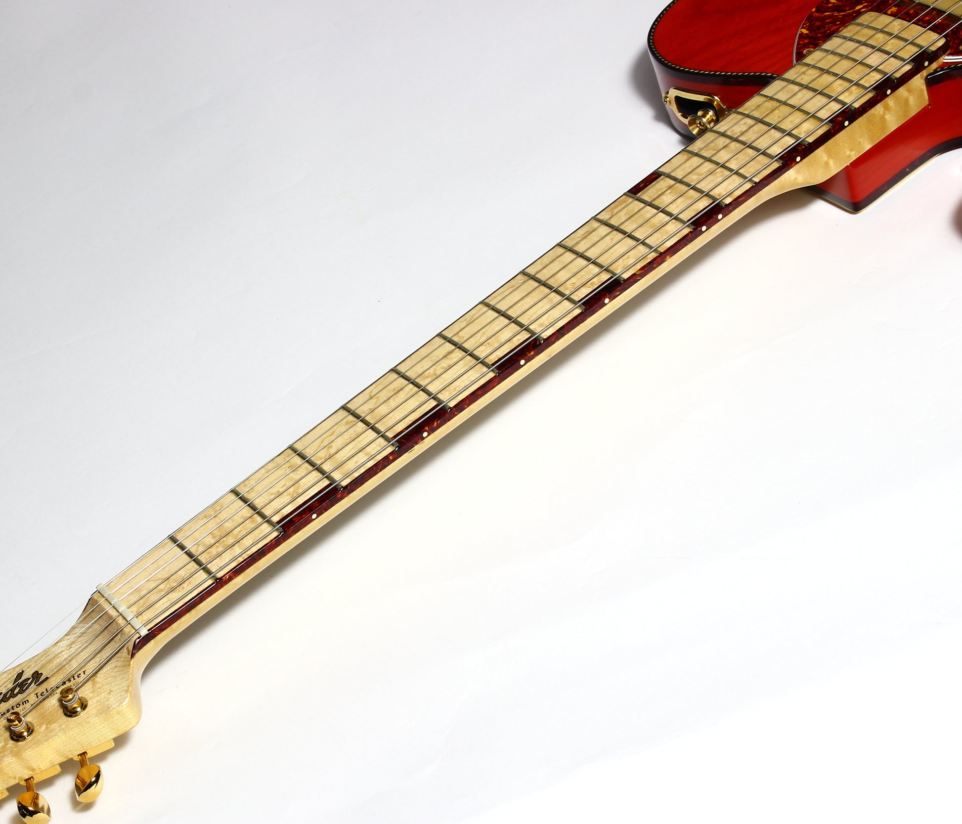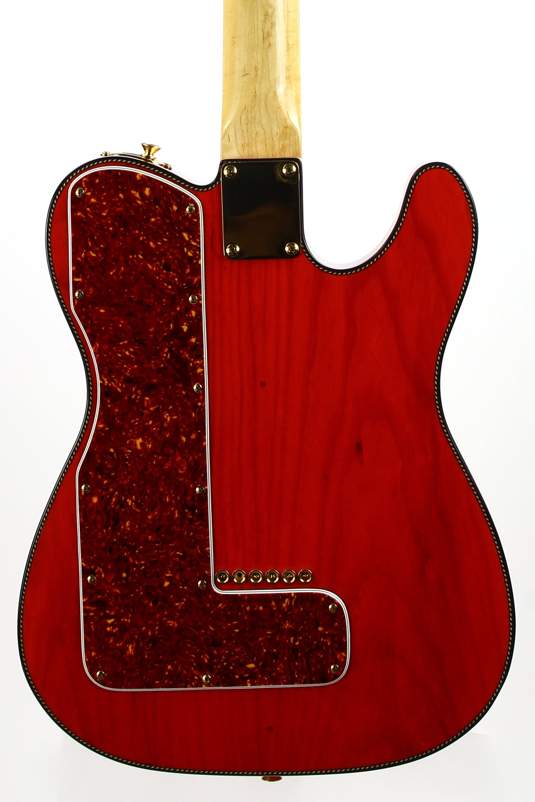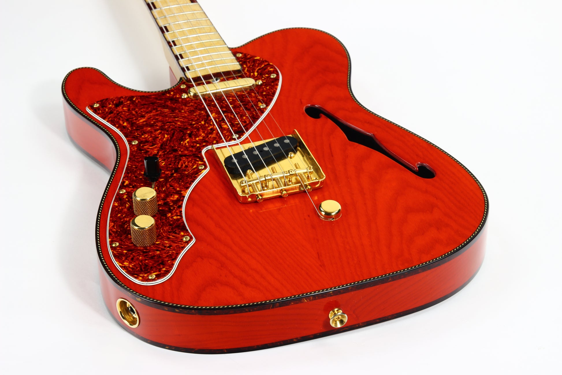 Beautiful double-bound Fender Custom Shop Masterbuilt Telecaster Thinline by early Fender master builder Fred Stuart. This tele features a load of custom appointments including double bound body with rope tortoise binding, B-Bender, transparent orange finish, Birdseye maple neck with unique tortoise inlays, dots on both sides of the fingerboard, gold hardware etc. One of the finest and unique early Fender Custom Shop Masterbuilts you’ll ever encounter.