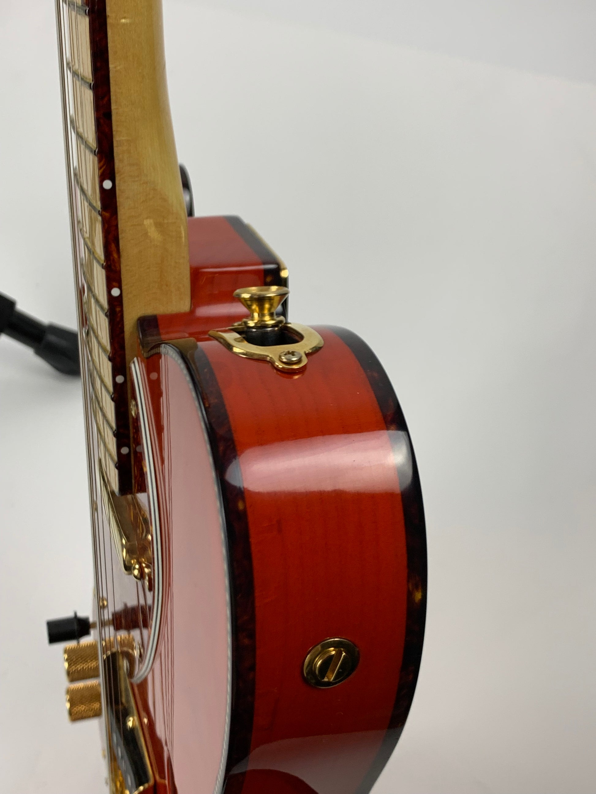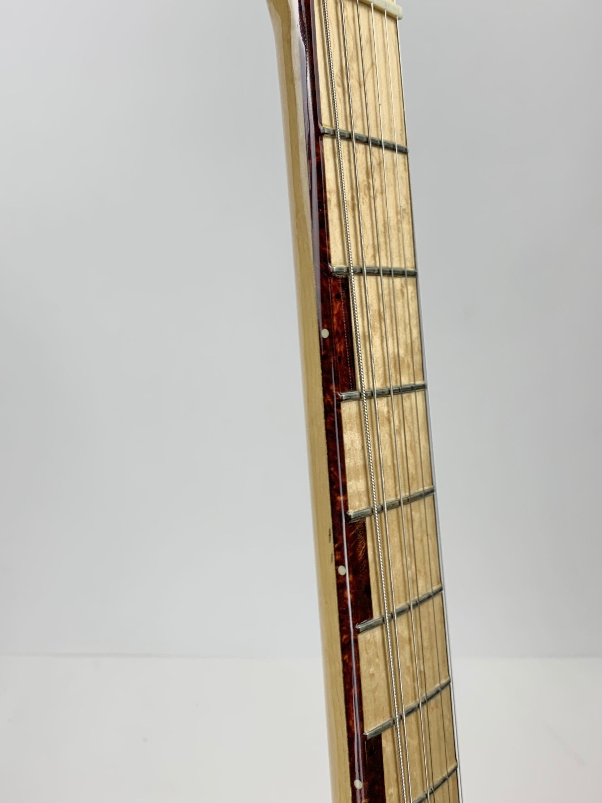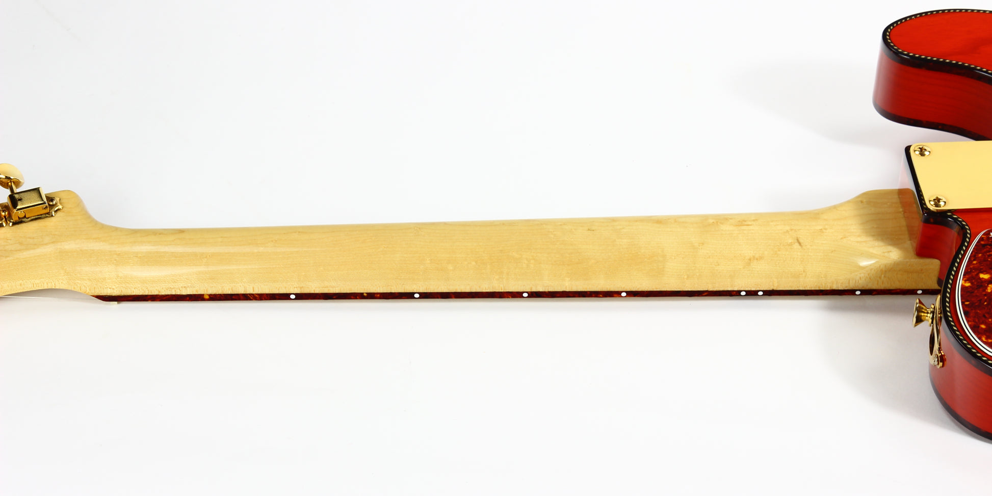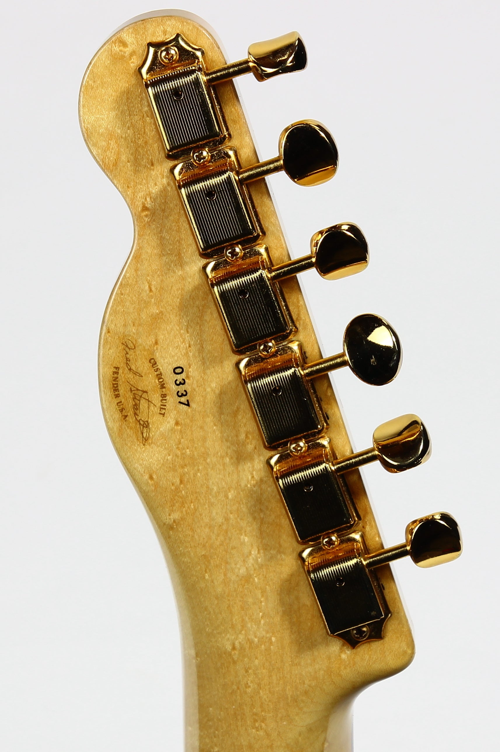 Beautiful double-bound Fender Custom Shop Masterbuilt Telecaster Thinline by early Fender master builder Fred Stuart. This tele features a load of custom appointments including double bound body with rope tortoise binding, B-Bender, transparent orange finish, Birdseye maple neck with unique tortoise inlays, dots on both sides of the fingerboard, gold hardware etc. One of the finest and unique early Fender Custom Shop Masterbuilts you’ll ever encounter.