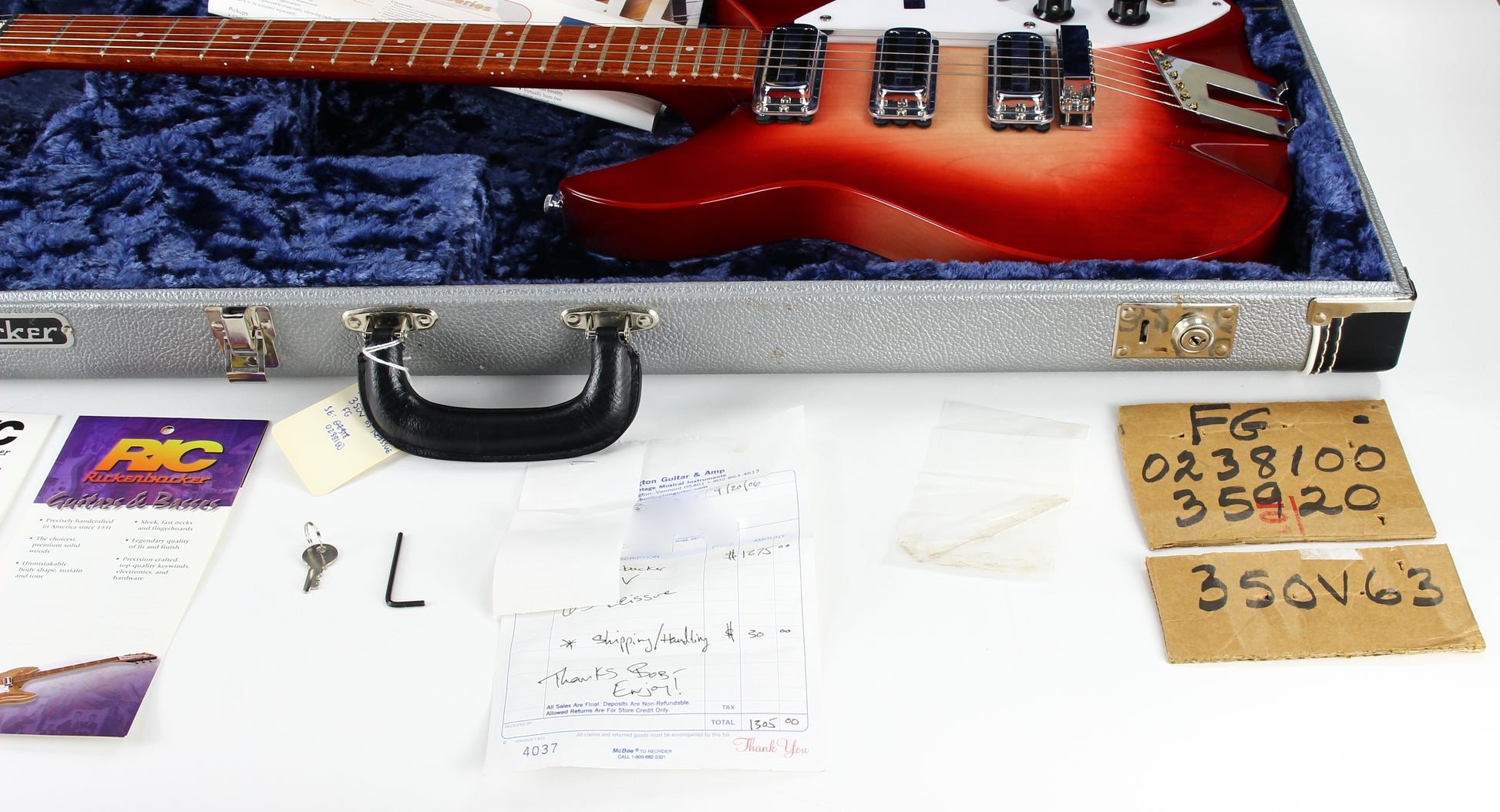 Here is a sweet Rickenbacker 350v63 in Fireglo. This one is all original and very clean. It's a really solid guitar and is a joy to play. Comes with the original silver reissue case with blue lining. The condition is excellent. Almost no wear at all except for normal finish checks on the fret ends in some spots. Check out our website for more photos and other important info!