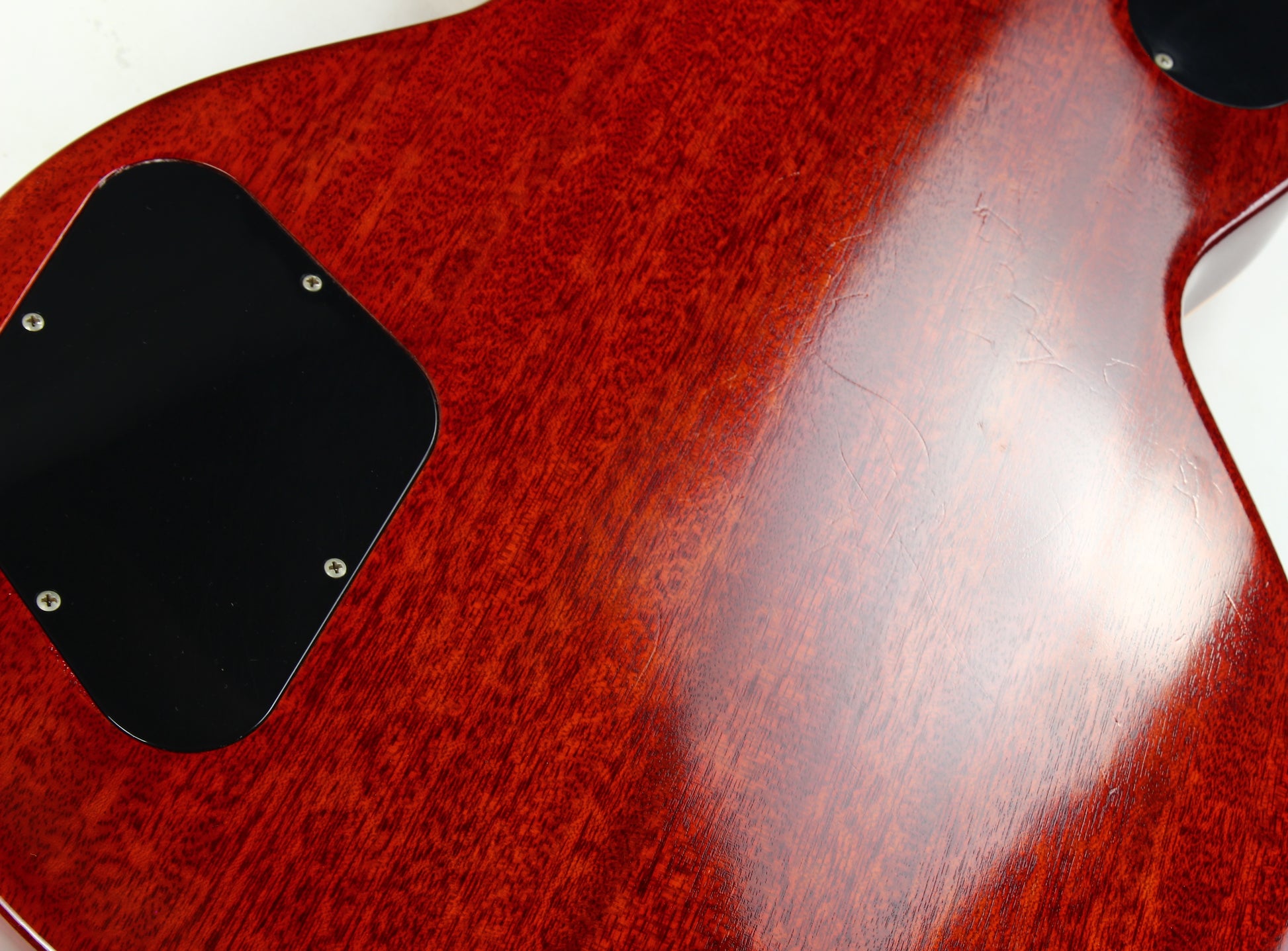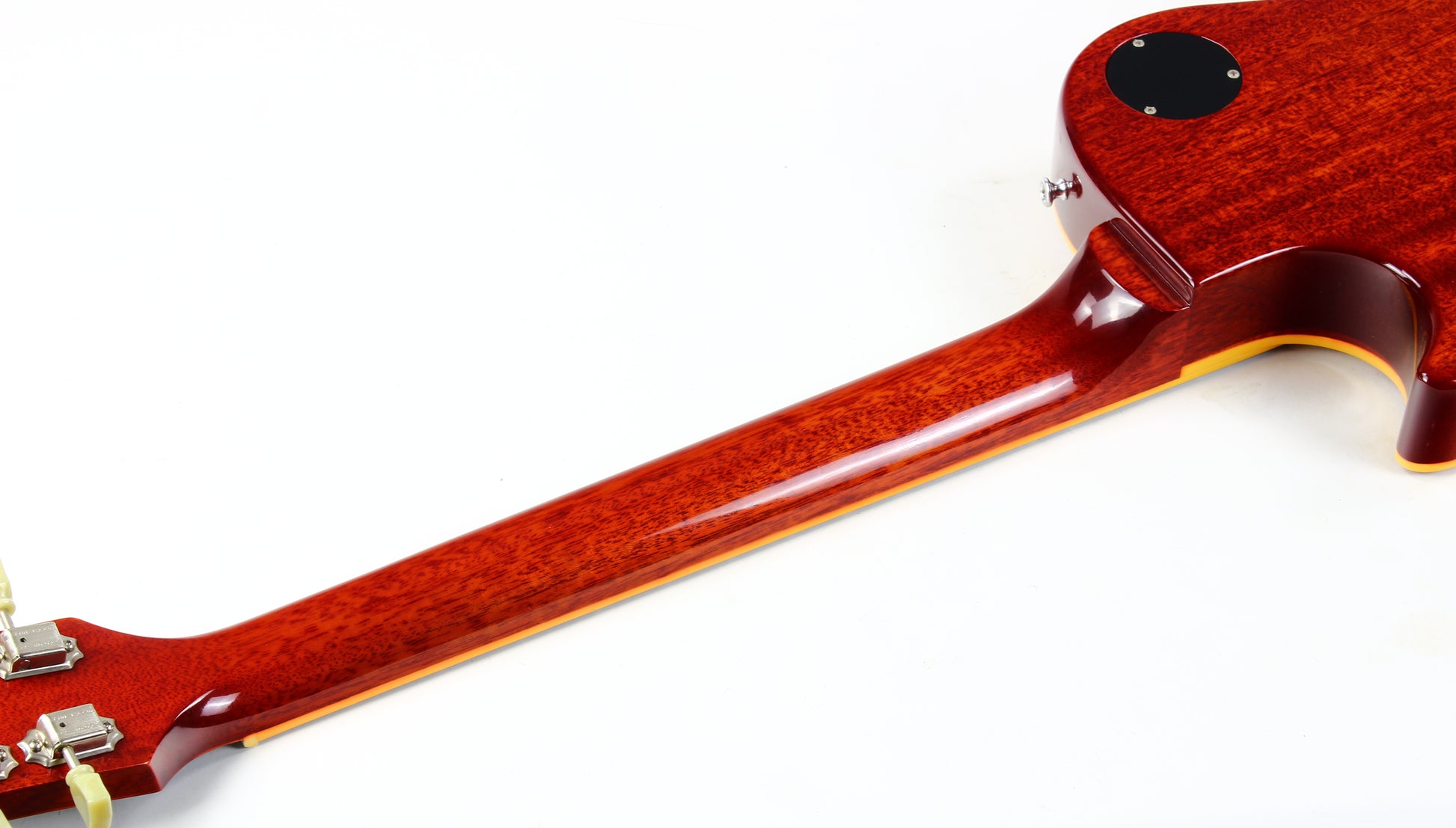 The guitar is very clean and 100% ORIGINAL, showing only a few rivet marks on the back and a couple small dings, all pictured. The Washed Cherry Sunburst finish looks fantastic, with pretty unusual light, tasteful figuring that shows up at the right angles—classic understated ’58 style. The neck is the expected big, round 1958 profile.