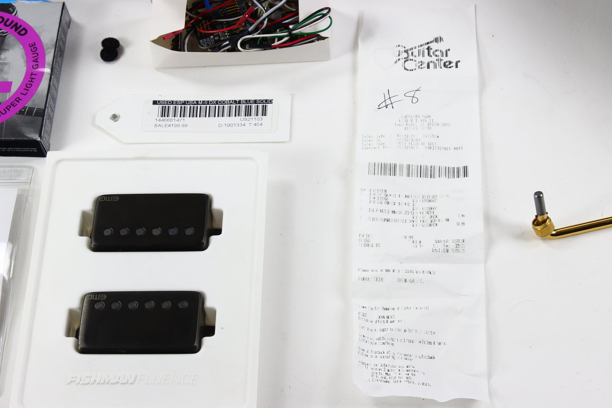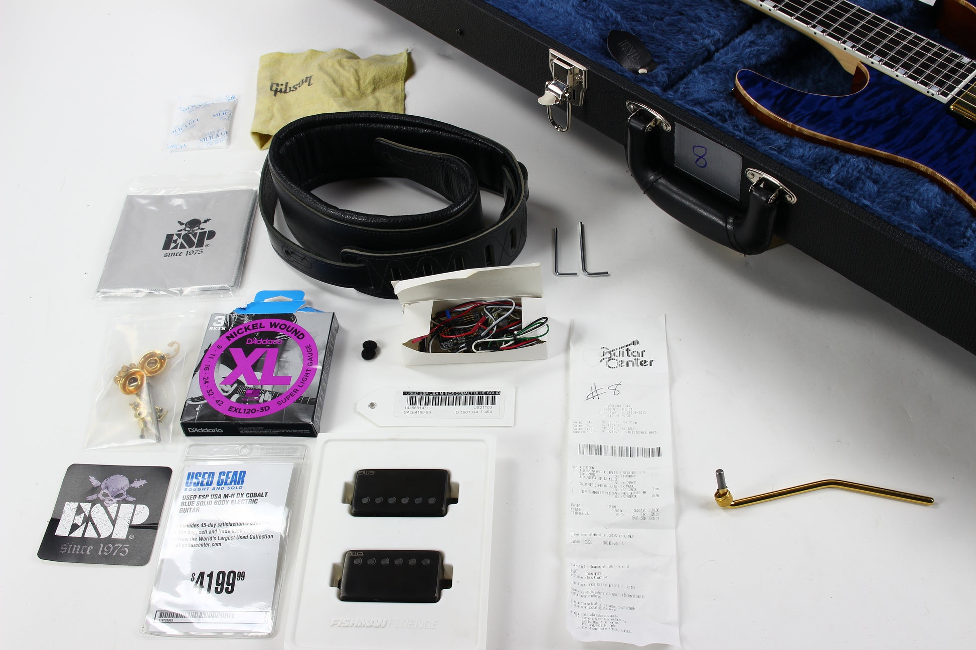 Here is an amazing Made in USA ESP MII DX in Cobalt Blue. Take a look at the spec sheet for more info. The pickups (and electronics) were changed to Fishman Fluence. All the original electronics are included including the original EMG's should you prefer to go back to them. The guitar sounds incredible with this setup though! Comes with the original hard case and all the paperwork including receipt etc...