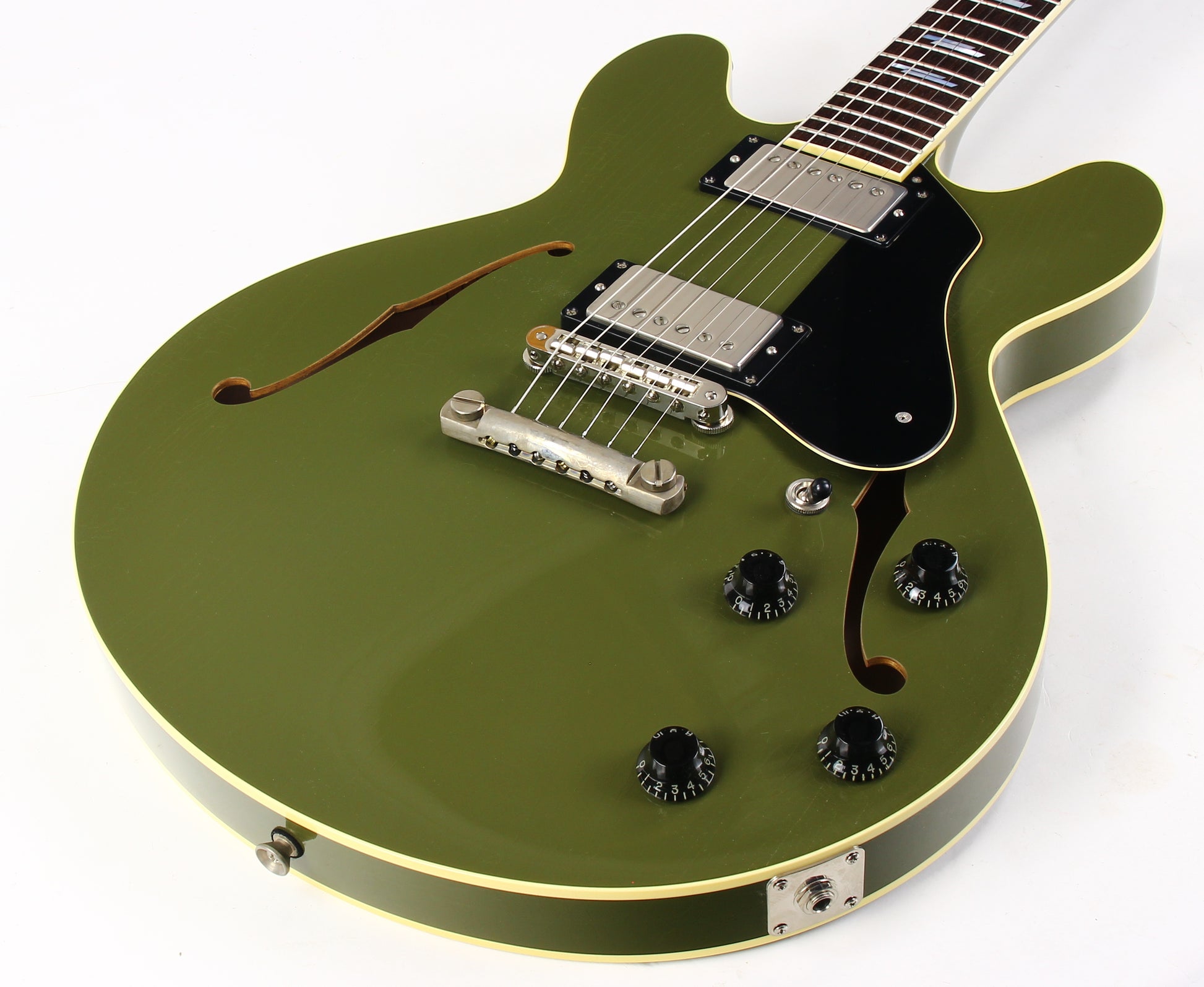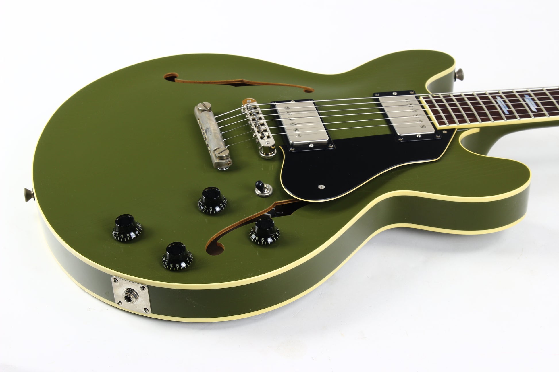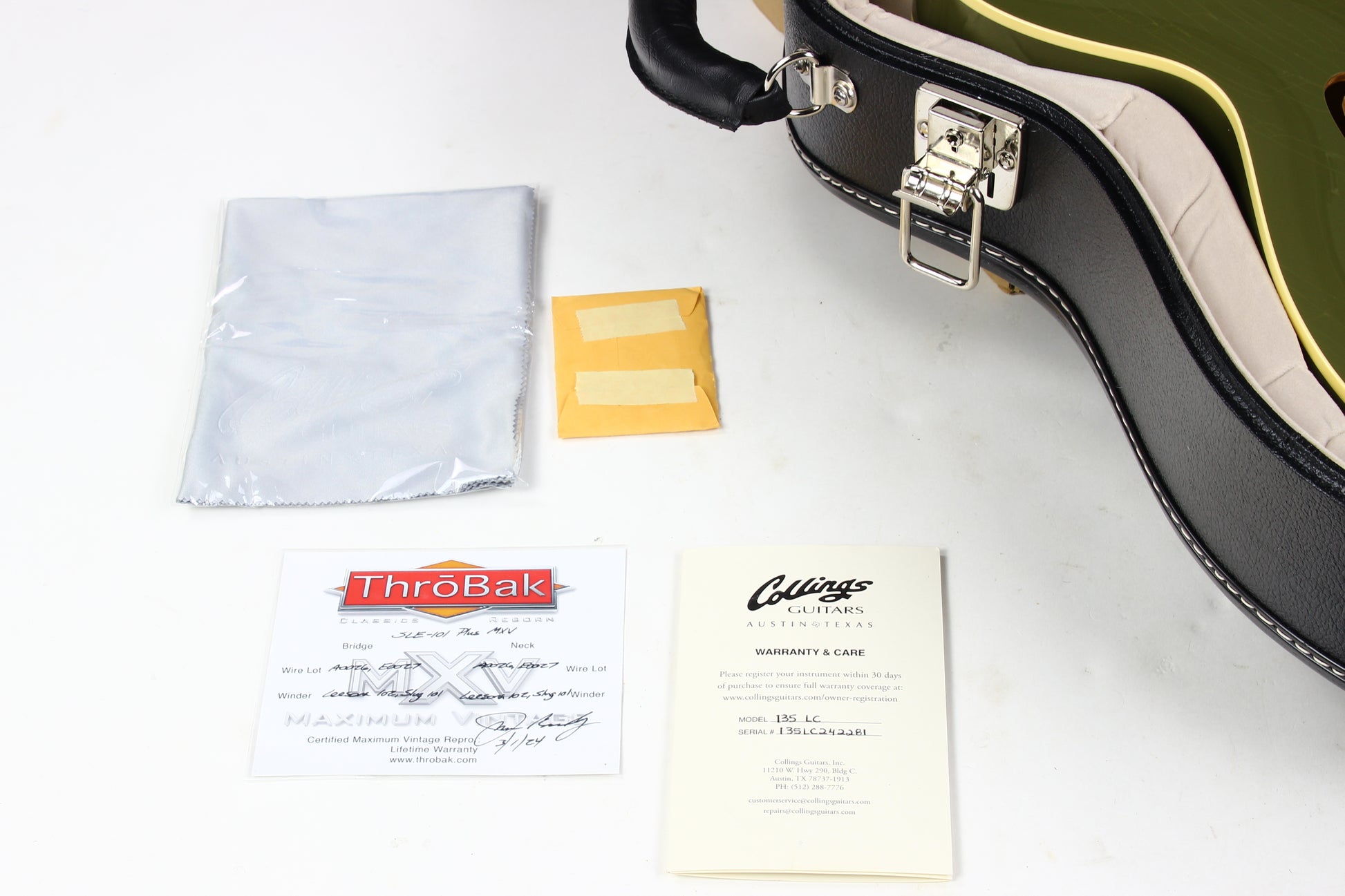 Beautiful 2024 Collings I-35 LC Aged in Olive Drab Green. Lightweight, plays easy, and sounds outstanding. Factory-aged finish with nice checking throughout. Outfitted with the factory Throbak SLE-101 Plus MXV humbuckers, which are always a great match for these.