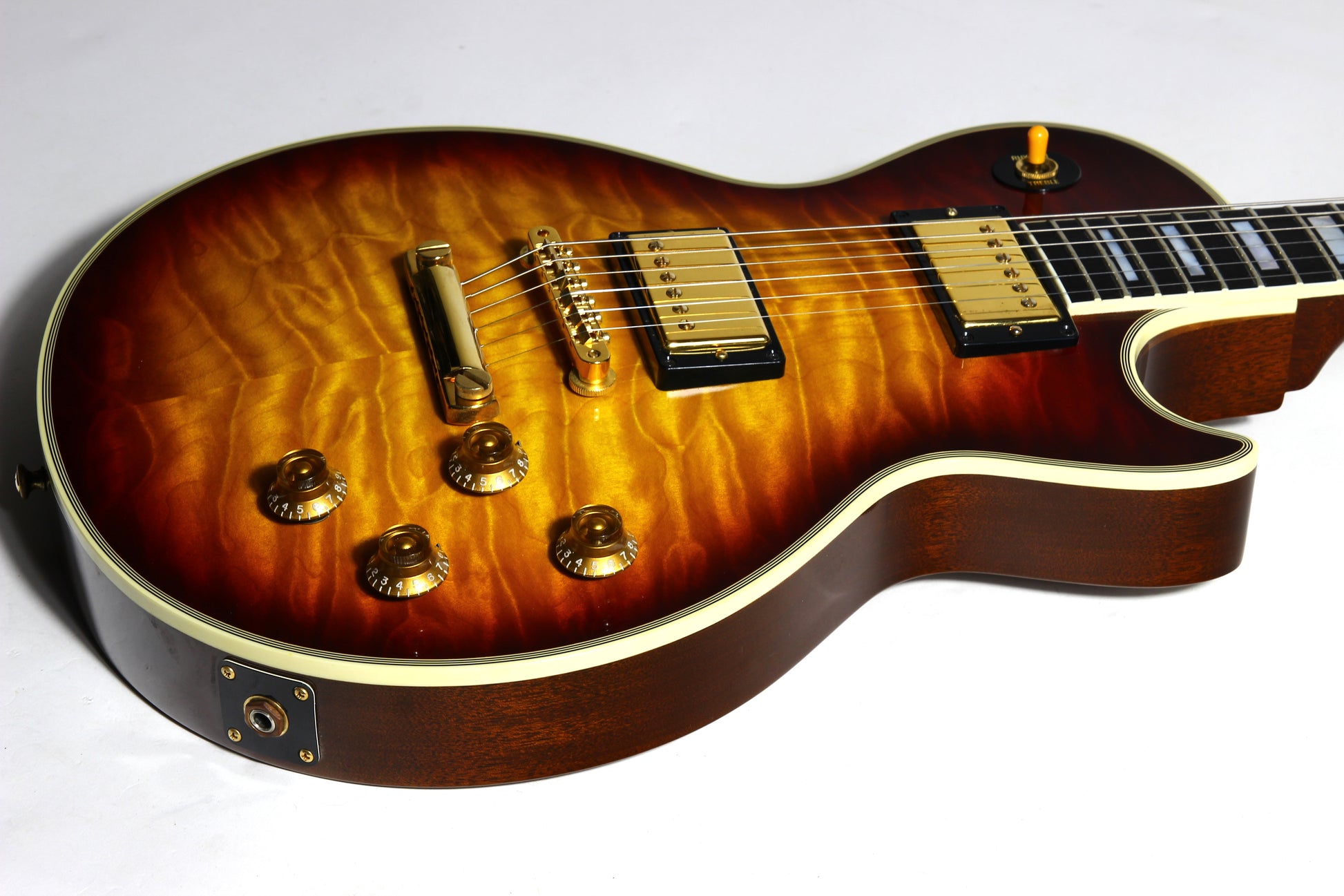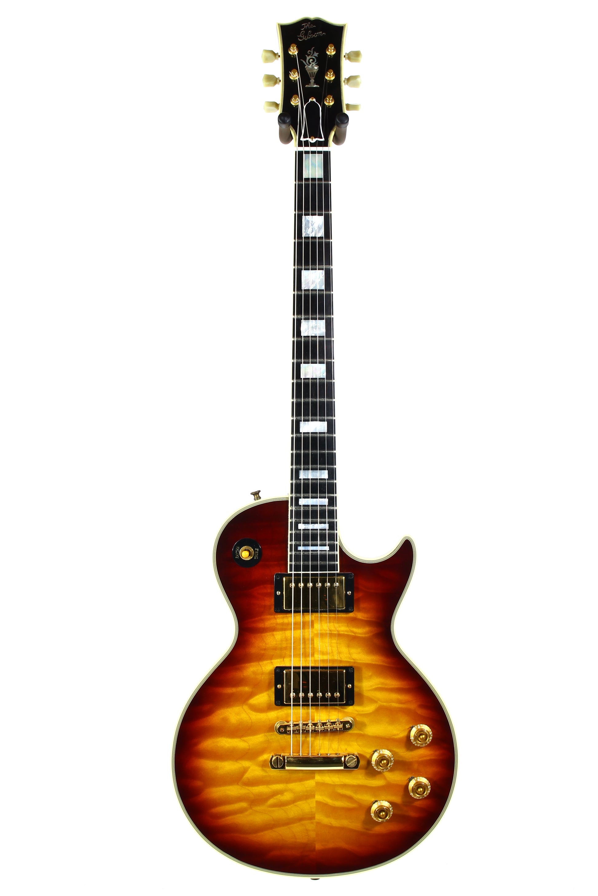 You want unique? Here's something you've probably never seen. It's a one-off R9 from 2005. 100% Original as it left the factory. So many unusual specs on this one. First off, the neck has a fleur-de-lis inlay and "The Gibson" logo, ebony fingerboard, full inlays similar to an L-5. Also the scale is 25.5 inches, there is a comfort contour on the back, all gold hardware, black reissue plastic parts, and there is an INSANE Quilt Top to really round out this one-of-a-kind Les Paul! The guitar is in excellent condition and looks to be rarely played. We noted one small indentation on the back and just the slightest traces of use. Easy near mint! Comes with the original hard case and all the paperwork as shown. The guitar plays easy and is really sounding like a great Les Paul should!