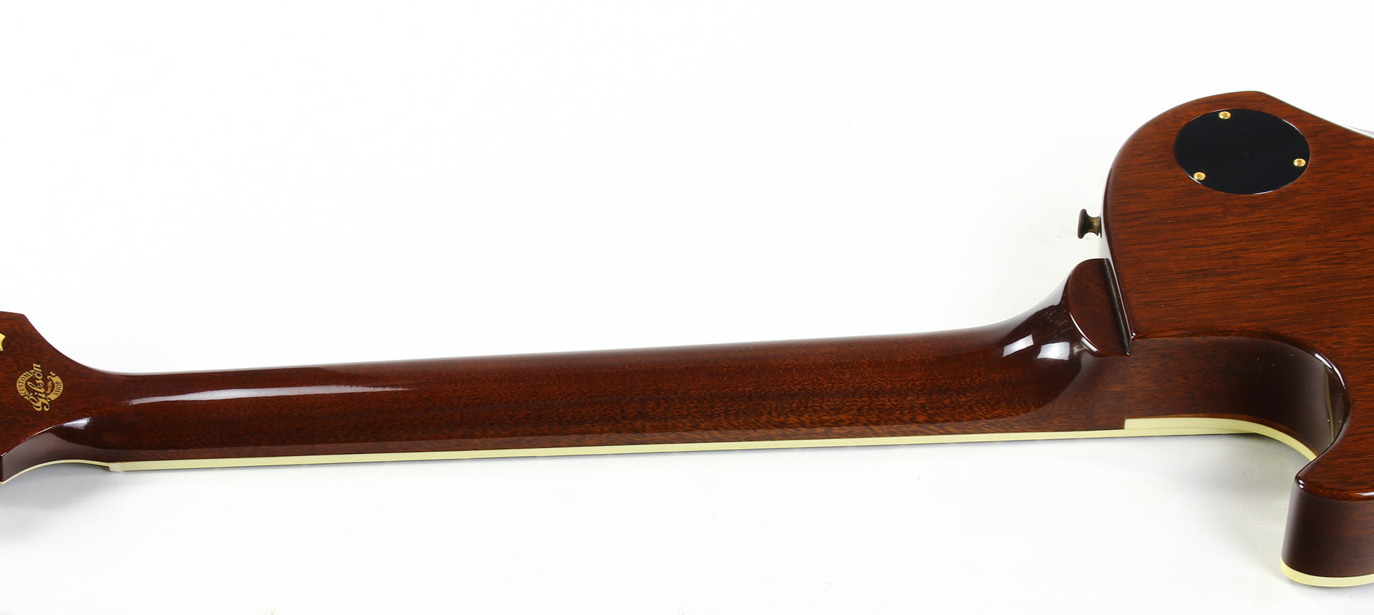 Headstock: Classic "The Gibson" logo with ornate fleur-de-lis inlay and elongated headstock