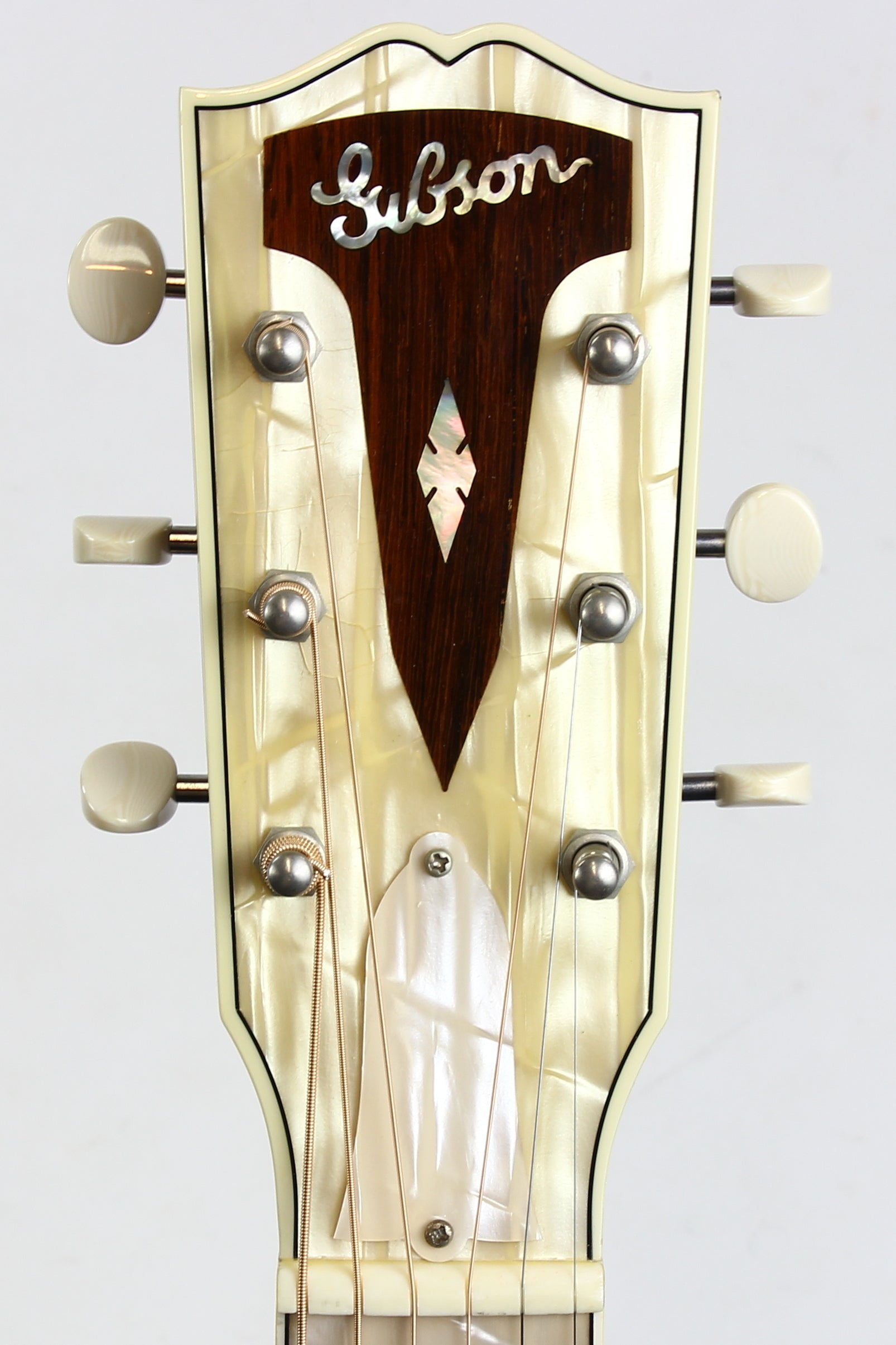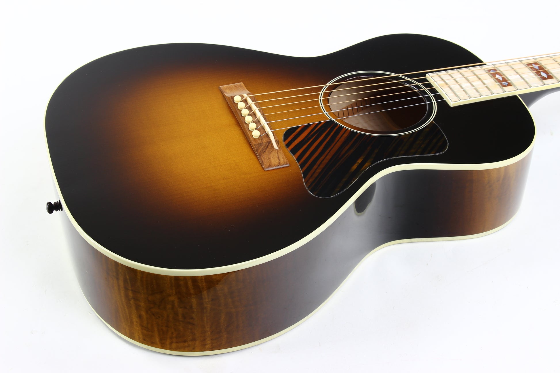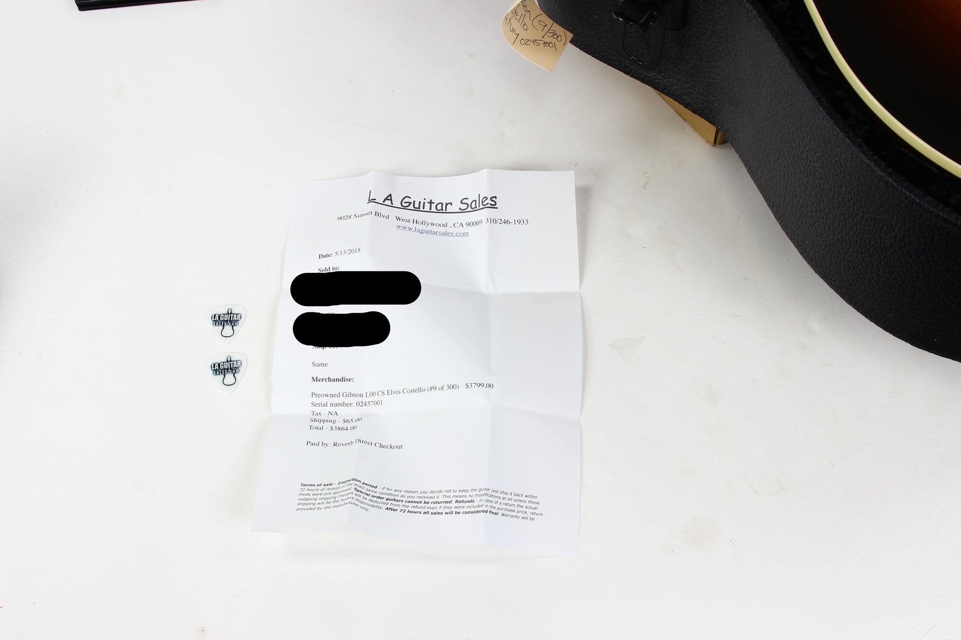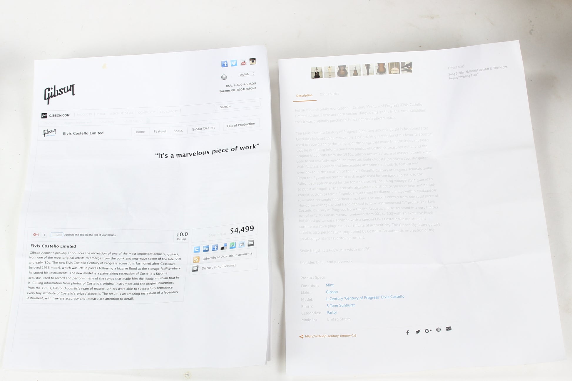 Low number 9! This is a very nice Gibson Custom Elvis Costello L-Century of Progress signature model acoustic guitar. This model is a remake of the original 1930's Gibson L Century of Progress. Really nice appointments that are very true to the original models. The guitar plays well and sounds great! The guitar is in excellent condition overall with no real wear to speak of. There are a couple checks in the pearloid headstock and a small indentation on the top. The maple is very nice and figured. Comes with the original and unique hardshell case, COA, and paperwork as shown. Really nice small body Gibson!