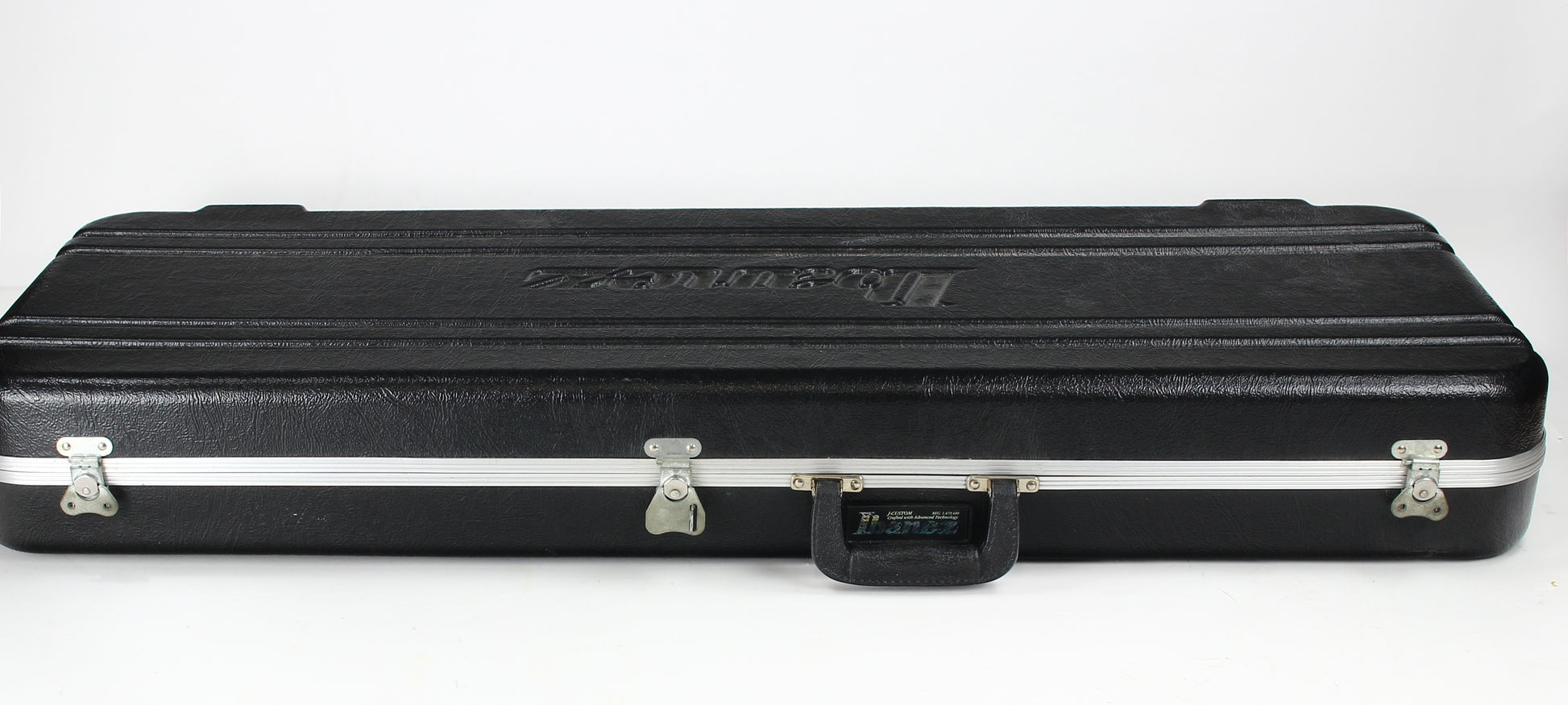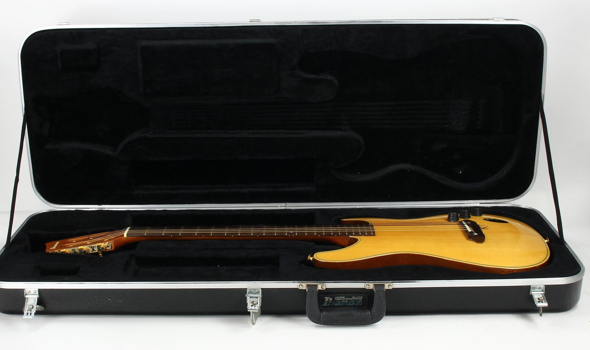 CONDITION: Excellent, near mint. Just some light fingernail scratches and a couple very tiny indentations as shown. Plastic still on back plate. Case has two pushed in case feet. Very unique and incredible instrument.